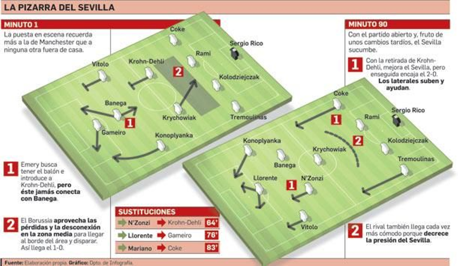 Tres pérdidas de Krohn-Dehli, una de Krychowiak, otra de Banega, una más de Vitolo, dos saques de banda mal ejecutados por Tremoulinas... El Borussia, aunque presionó arriba, no necesitó sudar para ganar posesiones en terreno adversario. Pese a ello, y hasta que el partido se abrió tras el 2-0, jamás pisó el área de Sergio Rico. Todas sus ocasiones se debieron a disparos lejanos, incluso el 1-0, en un centro-chut que pudo ser mejor defendido. La sentencia, porque eso y no otra cosa supuso el segundo gol, se debió a una basculación excesiva del Sevilla hacia su costado izquierdo.