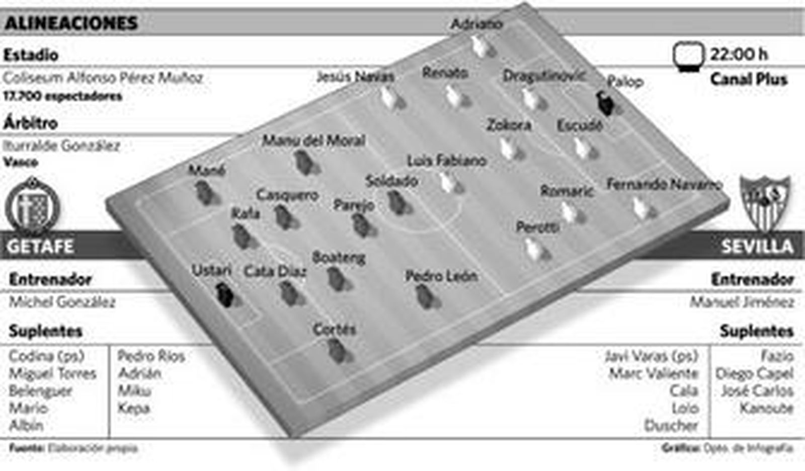 Por tanto, lo normal sería que el Sevilla afrontase este choque con Palop en la portería, una zaga de cuatro integrada por Adriano, Escudé, Dragutinovic y Fernando Navarro; un centro del campo con tres futbolistas dispuestos como en la ida de los cuartos de final contra el Deportivo de La Coruña que serían Renato, Zokora y Romaric; mientras que los dos extremos, en este caso Jesús Navas y Perotti, serían dos delanteros puros más para acompañar a Luis Fabiano arriba. De no haber una sorpresa mayúscula por algún problema físico de los hombres que están tocados, sobre todo en el caso de Dragutinovic, éstos serán los once encargados de defender el escudo sevillista en Getafe.