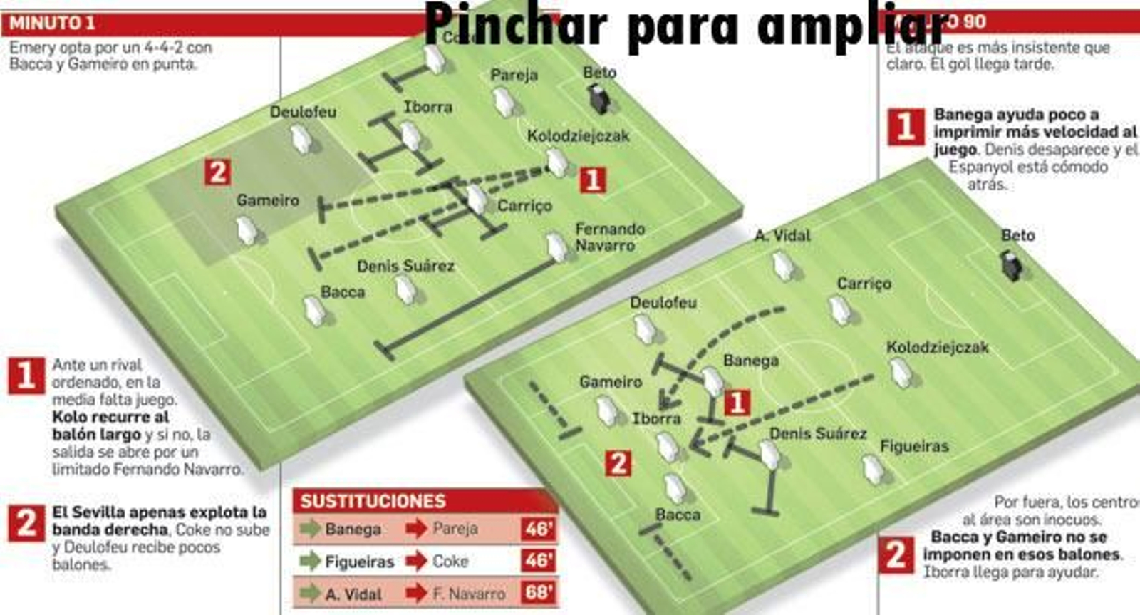 Unai cambió su habitual 4-2-3-1 por un 4-4-2 sobre el papel, que más bien era un 4-3-3, ya que Deulofeu se quedaba desenganchado arriba casi siempre. Quizá por ello Coke, por precaución, no subió todo lo que hubiera deseado. El caso es que en la primera parte, esa banda derecha trazó la única jugada de peligro franco, un pase corrido de Coke al desmarque de Deulofeu, que ganó la línea de fondo y sirvió un pase de la muerte que desaprovechó Bacca. Pero poco más buscó el Sevilla explotar ese flanco. Casi todo el juego desembocó por la siniestra, donde Fernando Navarro soportó más peso ofensivo del que la prudencia pide que lleve. Bacca y Gameiro no tuvieron balones al espacio y perdieron en el cuerpo a cuerpo con los centrales blanquiazules.