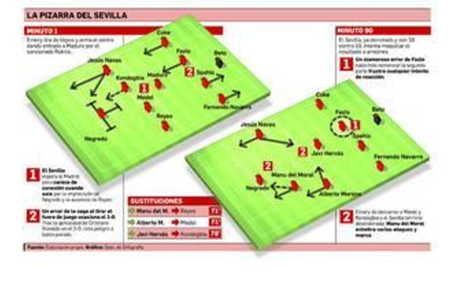 Emery intentó acorazar su sistema defensivo variando el habitual 4-2-3-1 hacia el 4-1-4-1. Maduro se ubicó por delante de la defensa y el Sevilla se pertrechó para esperar la hora de salir. La idea era no dejar mucho espacio al Madrid y evitar en lo posible que montara contragolpes cuando saliera el Sevilla. Todo se vino abajo con un balón a la espalda de la retaguardia. Spahic y Fernando Navarro se quedaron mientras que Fazio y Coke salieron, dejando el camino expedito a Higuaín y Cristiano Ronaldo. Poco después, el portugués eligió al jugador con menos reflejos, Maduro, para inventarse una bicicleta y un disparo eléctricos. El nítido error de Fazio al inicio de la segunda parte terminó de hundir el sistema, a lo que contribuyó que en los balones divididos faltó agresividad, como en ese balón alto que no ganó Maduro en el inicio del contragolpe que ocasionó el 4-0.