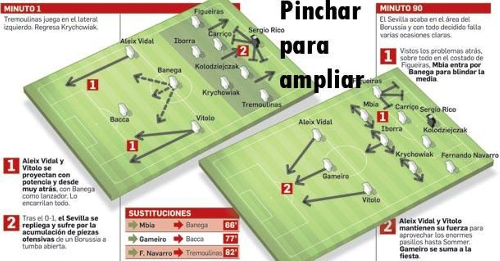 Tras el descanso, el Borussia jugó a hacer ronditos con Figueiras hasta que Emery metió a Mbia por Banega (65') y el camerunés reforzó la media con Iborra y Krychowiak, mirando de reojo al costado derecho.