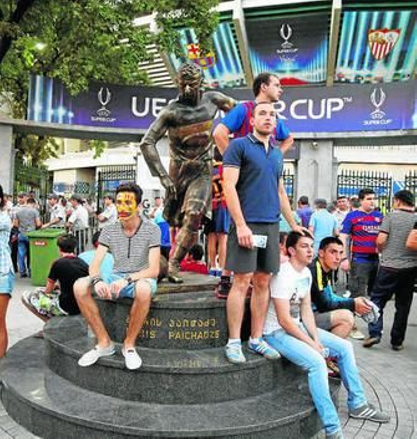 Varios hinchas ante la estatua del futbolista geogiano Boris Paichadze, que da nombre al estadio.