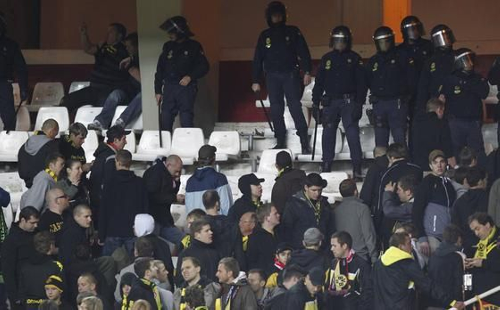 Hacía mucho tiempo que no se vivía una noche como la de ayer, una gran cita a la que se había convocado desde el club al sevillismo para contrarrestar la formidable fuerza de este joven, aguerrido y técnico equipo que manda en la Bundesliga. Y la afición, pese a que el estadio no se llenó, respondió recordando los viejos tiempos en los que el Sevilla era temible en Europa. El Sánchez-Pizjuán, entre el colorido propio y el ajeno, vivió un ambiente espectacular, sólo empañado por el grupo más radical de los aficionados del Dortmund, quienes antes del partido protagonizaron una fea escena arrancando las sillas de la zona de Gol Sur, sobre todo las de la tribuna baja. La Policía Nacional hubo de intervenir para calmar los ánimos, aunque a la salida de los equipos hubo otro gesto que incluso le puede costar dinero al Sevilla, dado que los hinchas alemanes encendieron y lanzaron bengalas, aunque según la legislación UEFA, los clubes son responsables de los daños que produzcan sus aficionados fuera de sus estadios. Por ejemplo, al Sevilla le costó una cantidad importante los destrozos que algunos hinchas hicieron en el estadio del Braga.
