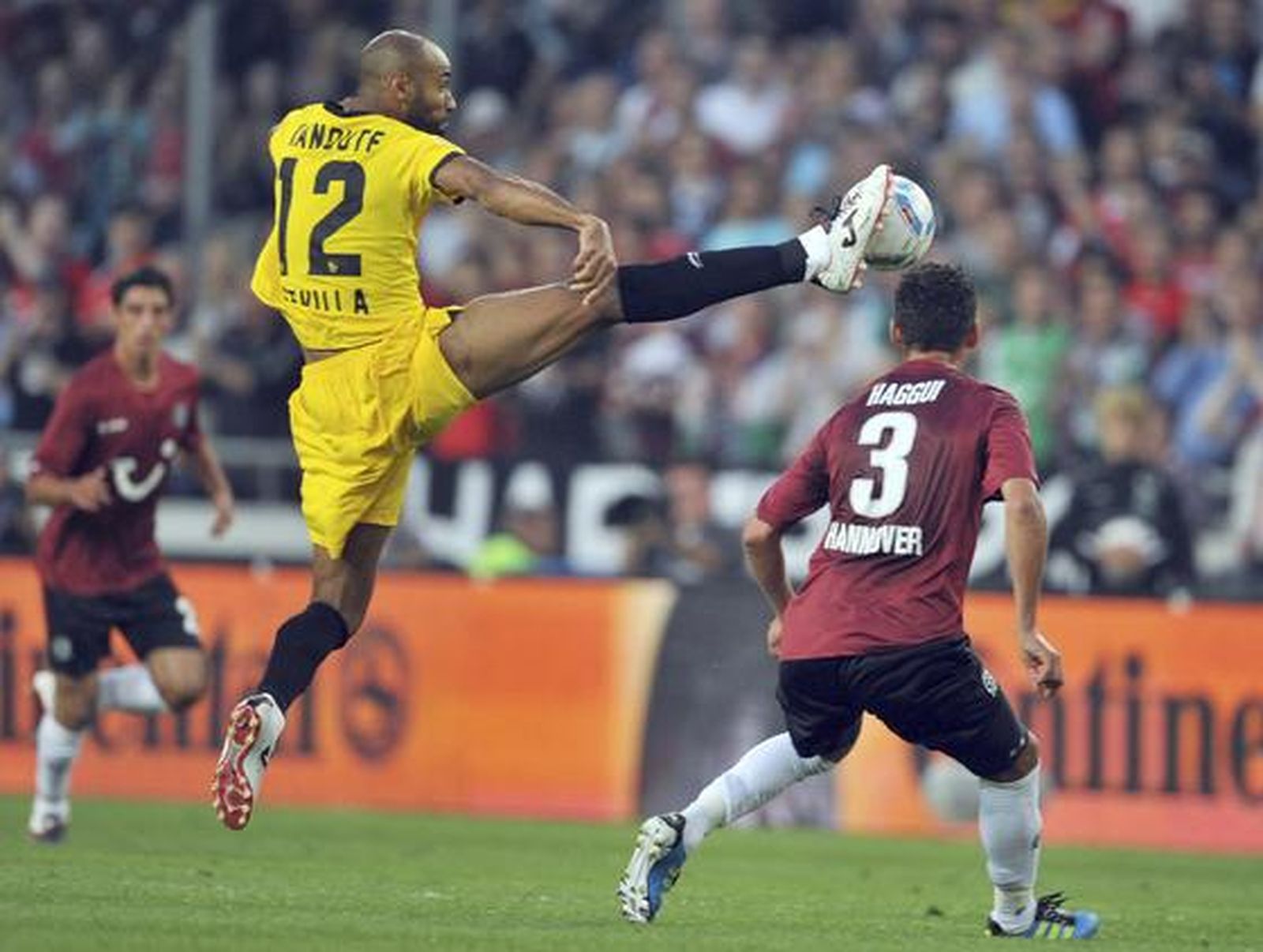 El ambiente se caldeó mucho más bien pronto. Cuando el Sevilla aún se hacía al escenario e intentaba enfriar aquello tocando en el campo contrario, un robo propició que el balón llegara al clarividente Pinto, que lanzó en largo hacia Schlaudraff, quien sorprendió por el primer palo a Palop. Spahic falló en el despeje y el meta esperaba un disparo cruzado de un delantero diestro. Un infortunio propio y un acierto rival ponían aquello cuesta arriba desde el principio, mientras el AWD-Arena atronaba aún más que antes.