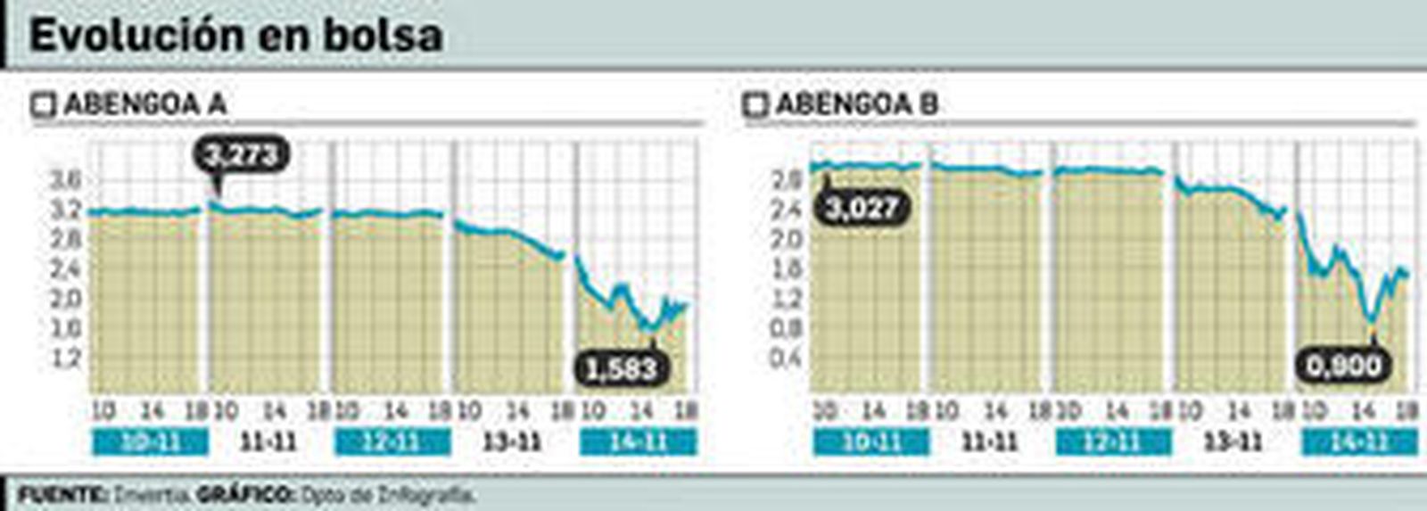 Las títulos A de la compañía, que cotizan en el Mercado Continuo, bajaron casi un 25%, situándose el valor de cierre en 1,92 euros. Abengoa, uno de los valores preferidos por inversores bajistas, mantiene dos tipos de acciones desde otoño de 2012 con diferentes derechos políticos. Los titulares de acciones clase A cuentan con cien derechos de voto mientras que los de clase B disponen de un único derecho de voto. Esta conversión permite a las familias fundadoras y al núcleo estable de accionistas mantener el control de la empresa pese a la dilución de su participación. La suma de ambos valores arroja una capitalización bursátil de 1.295 millones de euros al cierre de ayer.