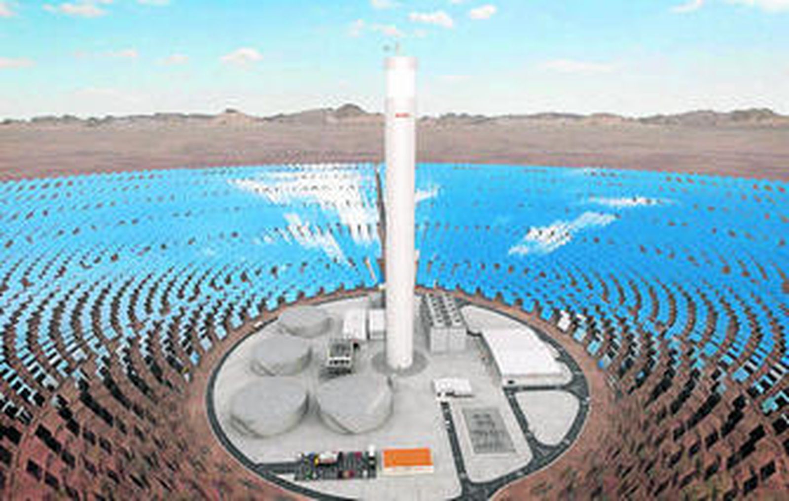 Por su parte, la planta termosolar, cuya construcción comenzó en 2014, tendrá 10.600 heliostatos con una superficie total para el campo solar de más de 700 hectáreas. Los heliostatos concentran la radiación solar en un punto, el receptor, ubicado en la parte superior de una torre de 250 metros de altura. La radiación del sol se emplea para calentar sales fundidas que se utilizan para generar vapor con el que se alimenta una turbina de 110 MW que genera electricidad limpia y sin emisiones.