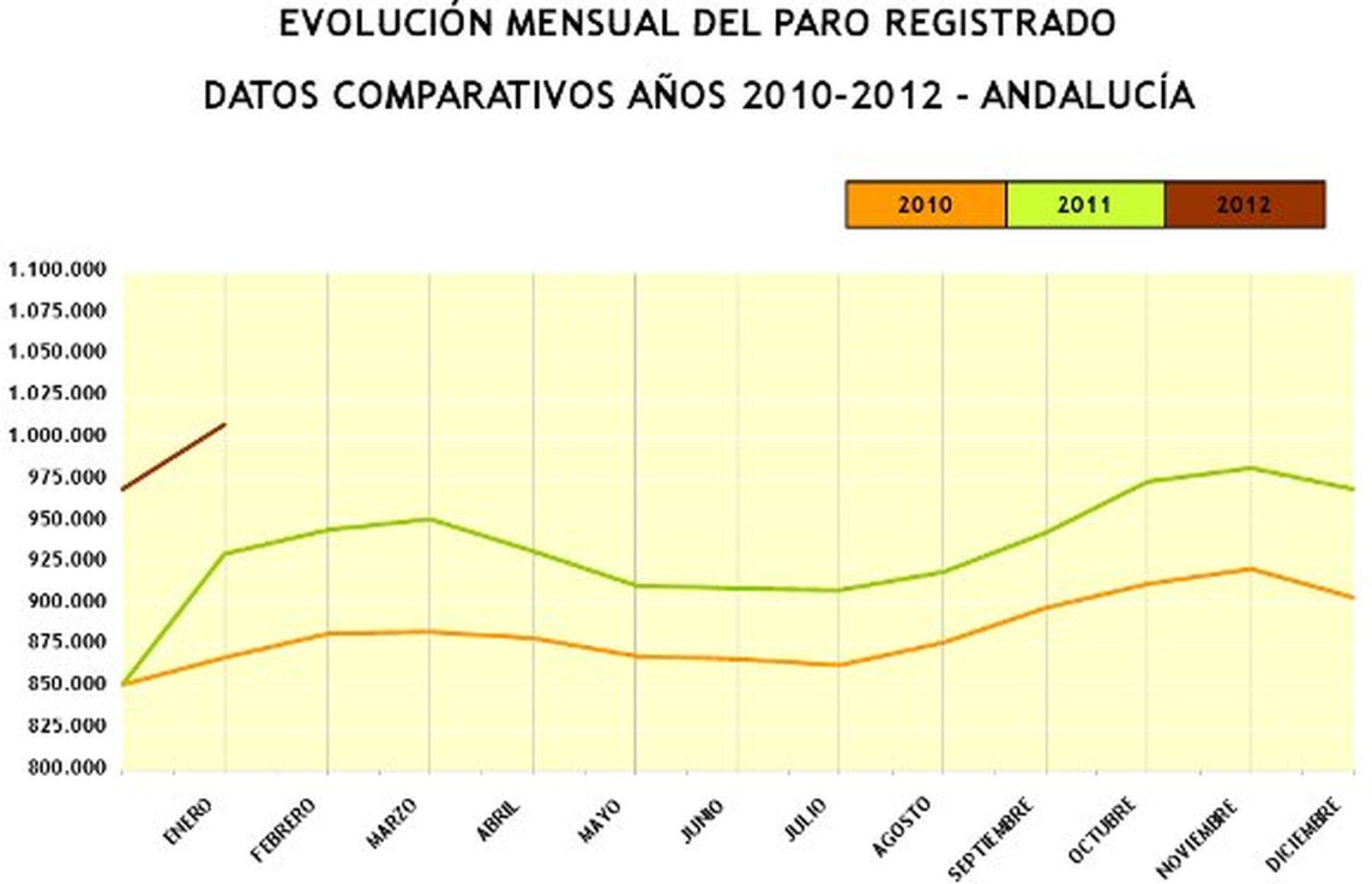 El número de parados registrados en las oficinas del Instituto Nacional de Empleo (INEM) en Andalucía aumentó en el mes de enero de 2012 en 39.050 personas, lo que supone un incremento del 4,03 por ciento respecto al mes anterior, según los datos facilitados este jueves por el Ministerio de Trabajo e Inmigración, con lo que se supera el millón de desempleados en Andalucía.