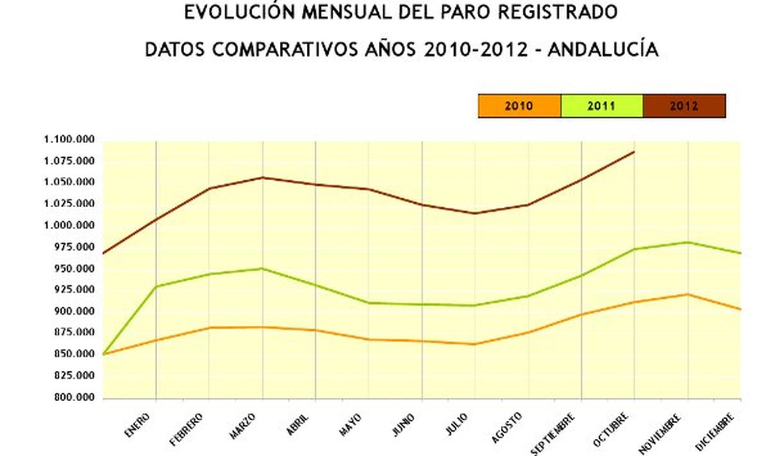 El número de parados registrados en las oficinas del Servicio Público de Empleo Estatal (SEPE) en Andalucía aumentó en el mes de octubre de 2012 en 32.139 personas, lo que supone un incremento del 3,05 por ciento respecto al mes anterior, según los datos facilitados este martes por el Ministerio de Empleo y Seguridad Social, con lo que se alcanzan los 1.087.248 desempleados en Andalucía. El número total de desempleados en la Comunidad se sitúa en 1.087.248 trabajadores. En términos interanuales, el paro aumentó en 113.086 personas, lo que representa un incremento del 11,61 por ciento respecto al mismo mes del año anterior.