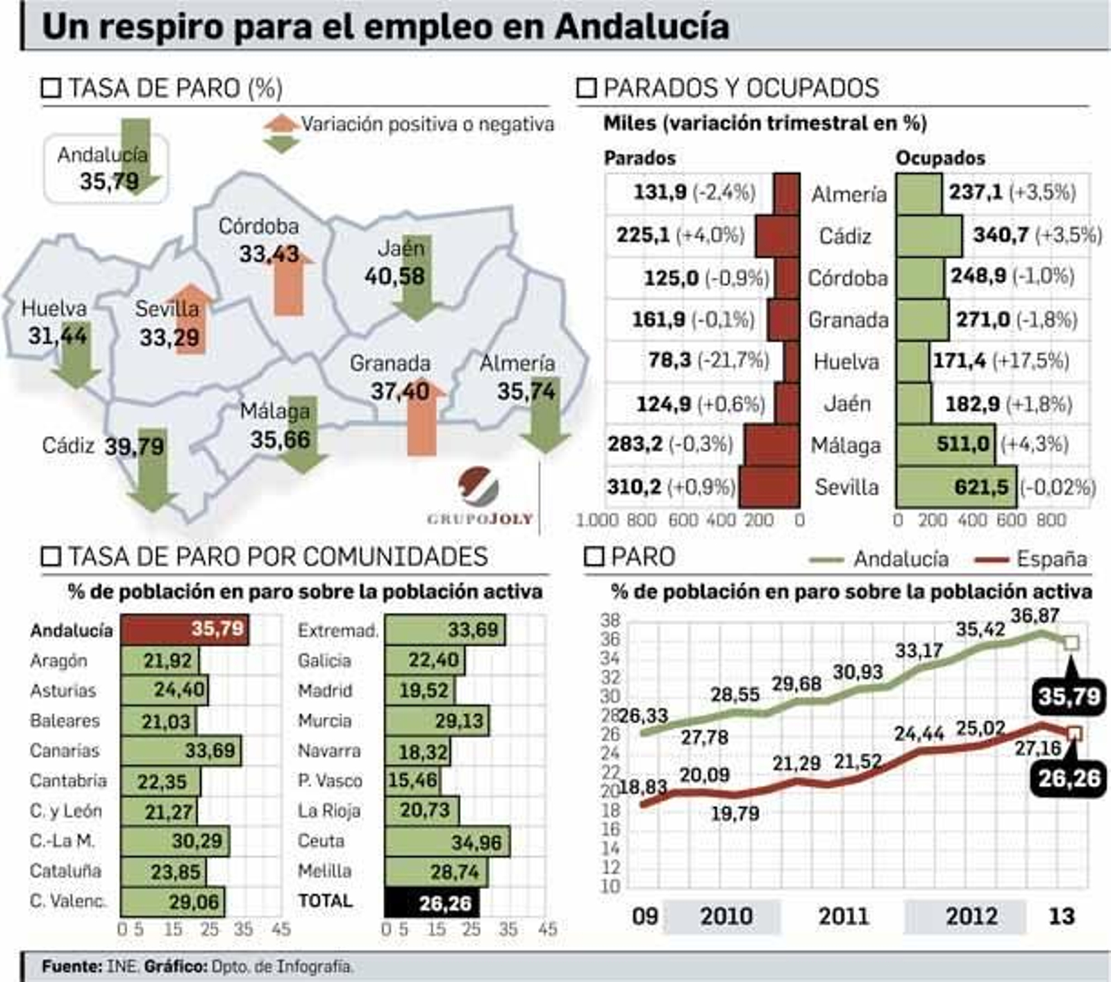 Andalucía ascendió en el segundo trimestre de 2013 y fue la primera comunidad con mayor tasa de paro. La Comunidad es la tercera zona que mayor descenso absoluto del número de parados registró en relación con el trimestre anterior, tras Comunidad de Madrid (39.400) y Baleares (38.300). En relación con el mismo trimestre del pasado año, la Comunidad fue la zona con mayor incremento absoluto del número de parados.