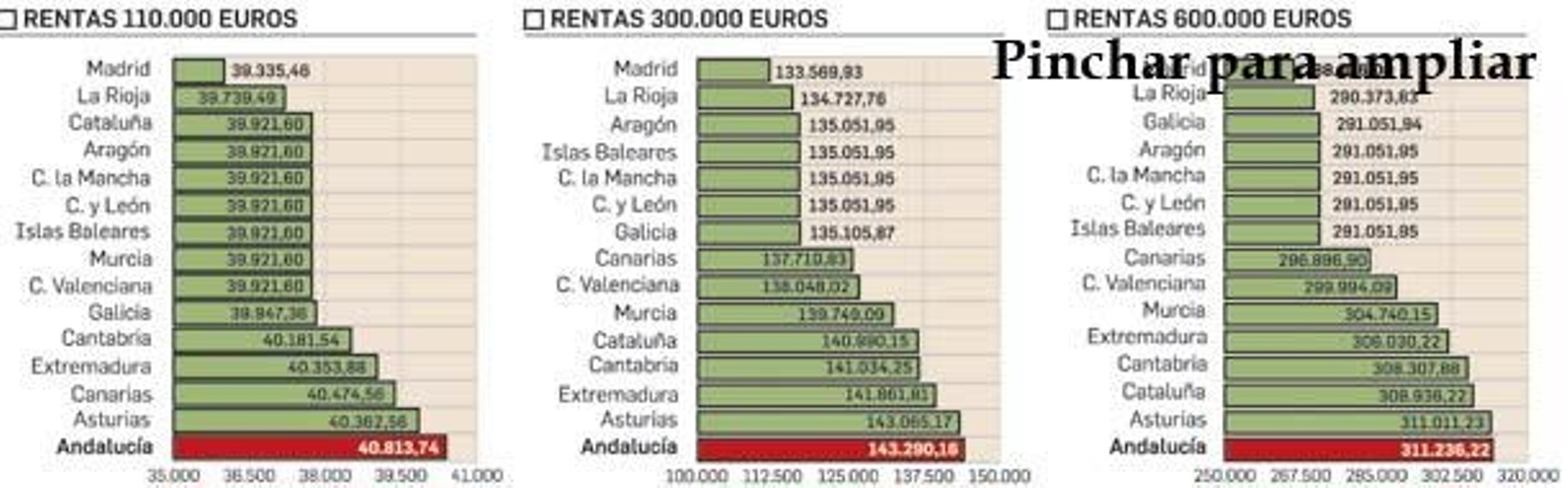 La situación se repite en otros impuestos como Patrimonio o Sucesiones. Mientras que en Madrid el pago es cero, al estar completamente bonificado, para un patrimonio de 800.000 euros en Cataluña se pagan 769 euros, mientras que en el resto el importe oscila entre los 200 y los 300 euros. Para una herencia también de 800.000 euros, la diferencia de lo que se paga en Murcia o Andalucía por Sucesiones y el coste en Cantabria, La Rioja y Madrid superaría los 162 euros.