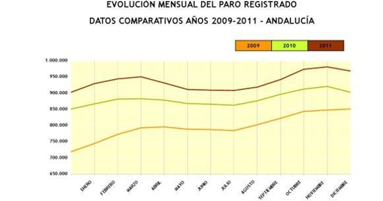 Por sexos, en la comunidad andaluza, de los 969.152 desempleados registrados al cierre de 2011, 491.760 fueron mujeres y 477.392 fueron hombres.