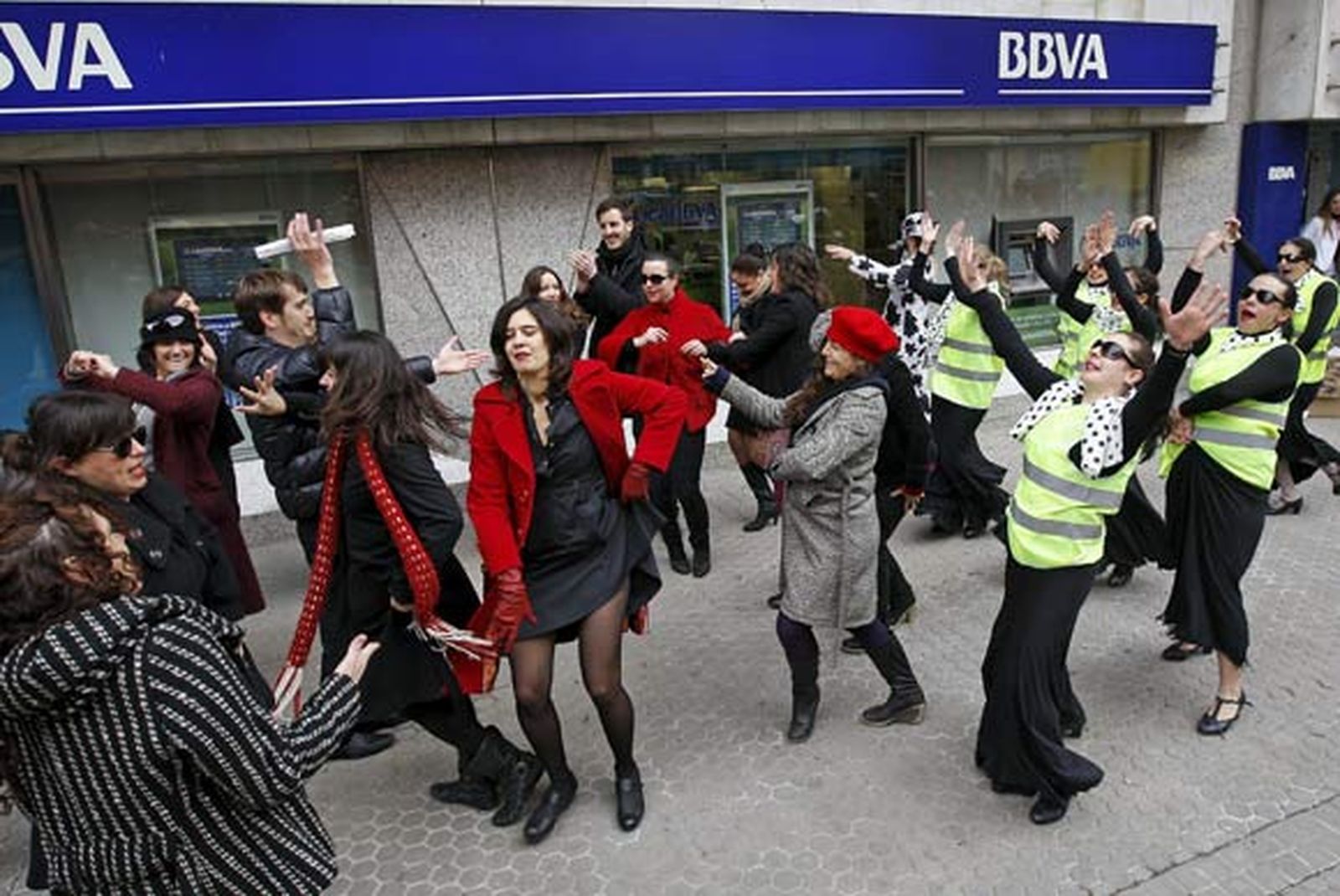 Cinco bailaoras de flamenco, ataviadas con chalecos reflectantes y grandes trapos blancos, han bailado y limpiado con ellos los cristales de la oficina bancaria.