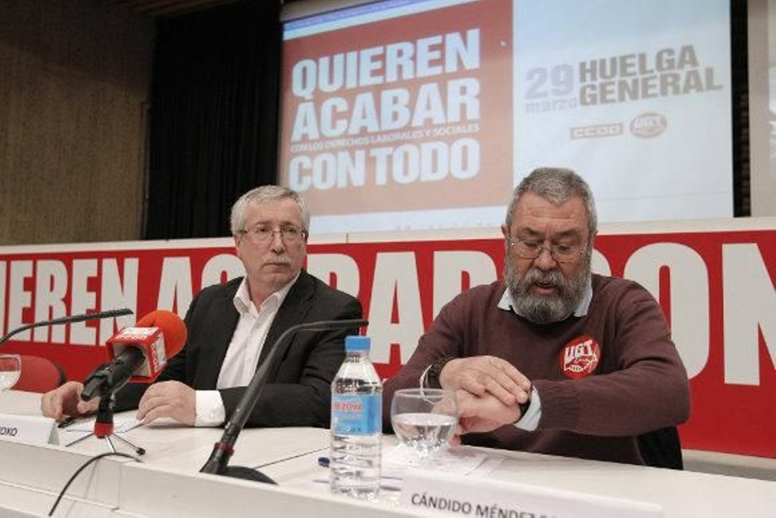 Los secretarios generales de UGT, Cándido Méndez, y CCOO, Ignacio Fernández Toxo, confían en una respuesta "masiva" a la convocatoria de huelga del próximo jueves y esperan que la jornada sirva para abrir un proceso de negociación con el Gobierno y que éste rectifique la reforma laboral.