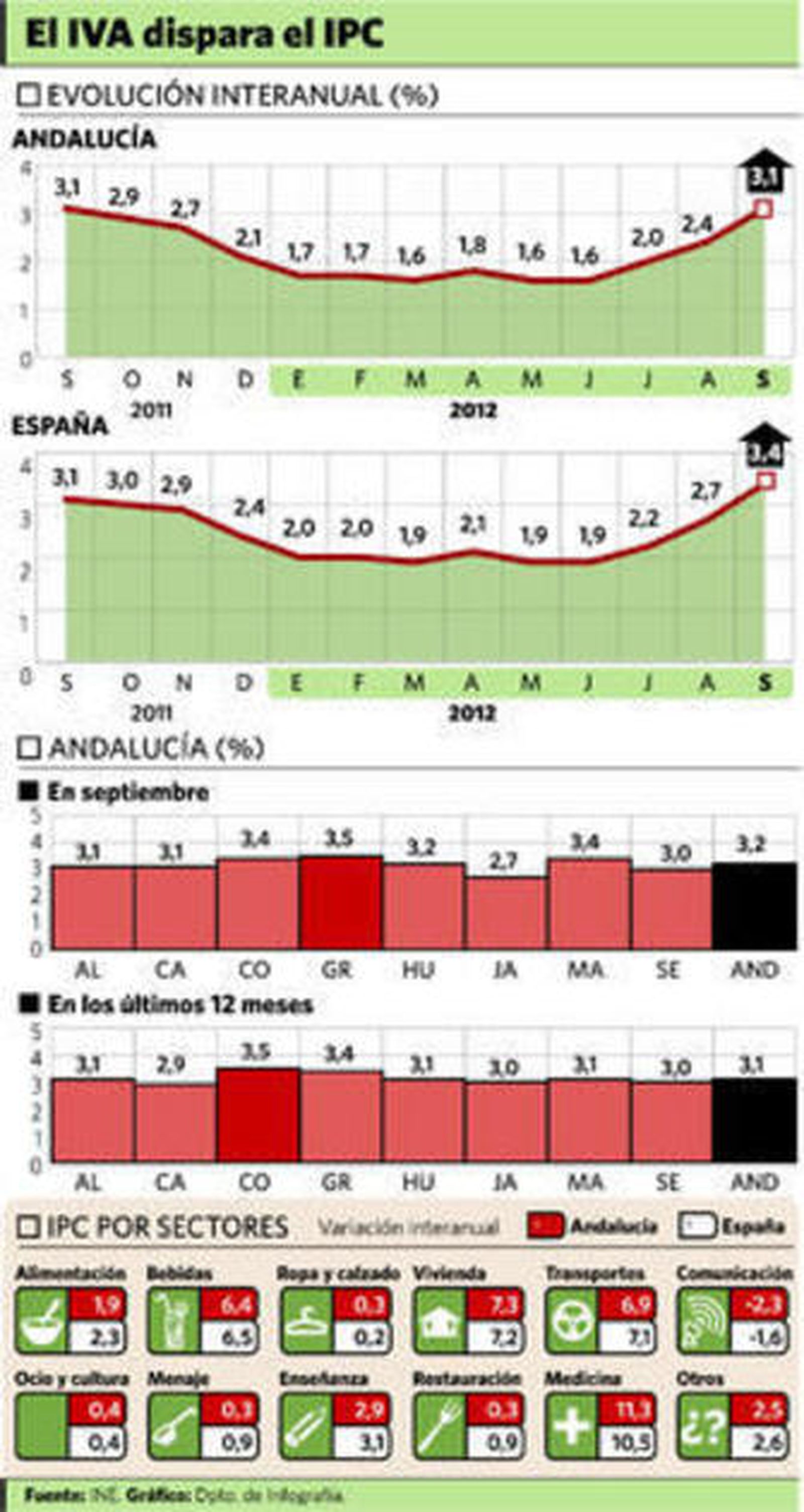 En Andalucía, el IPC subió el 1,1% en septiembre con respecto al mes anterior, de forma que la tasa interanual se quedó en el 3,1%, tres décimas menos que a nivel nacional. Por sectores, en Andalucía durante el mes de septiembre los precios aumentaron en relación con el mes anterior en vestido y calzado (4,7%), medicina (4,6%) y comunicaciones (2,4%).