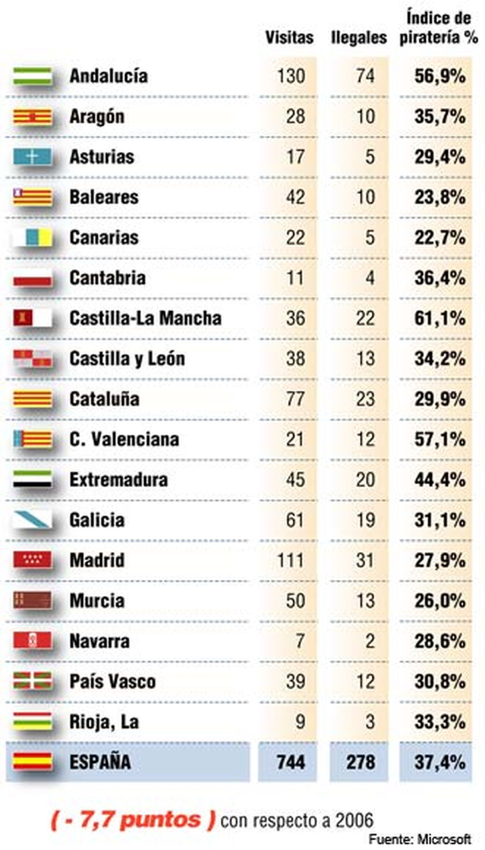 Aunque, en términos generales, el índice de piratería en España descendió un 7,7 por ciento con respecto a 2006, según el estudio, el porcentaje de software no original difiere en las distintas comunidades autonómas.