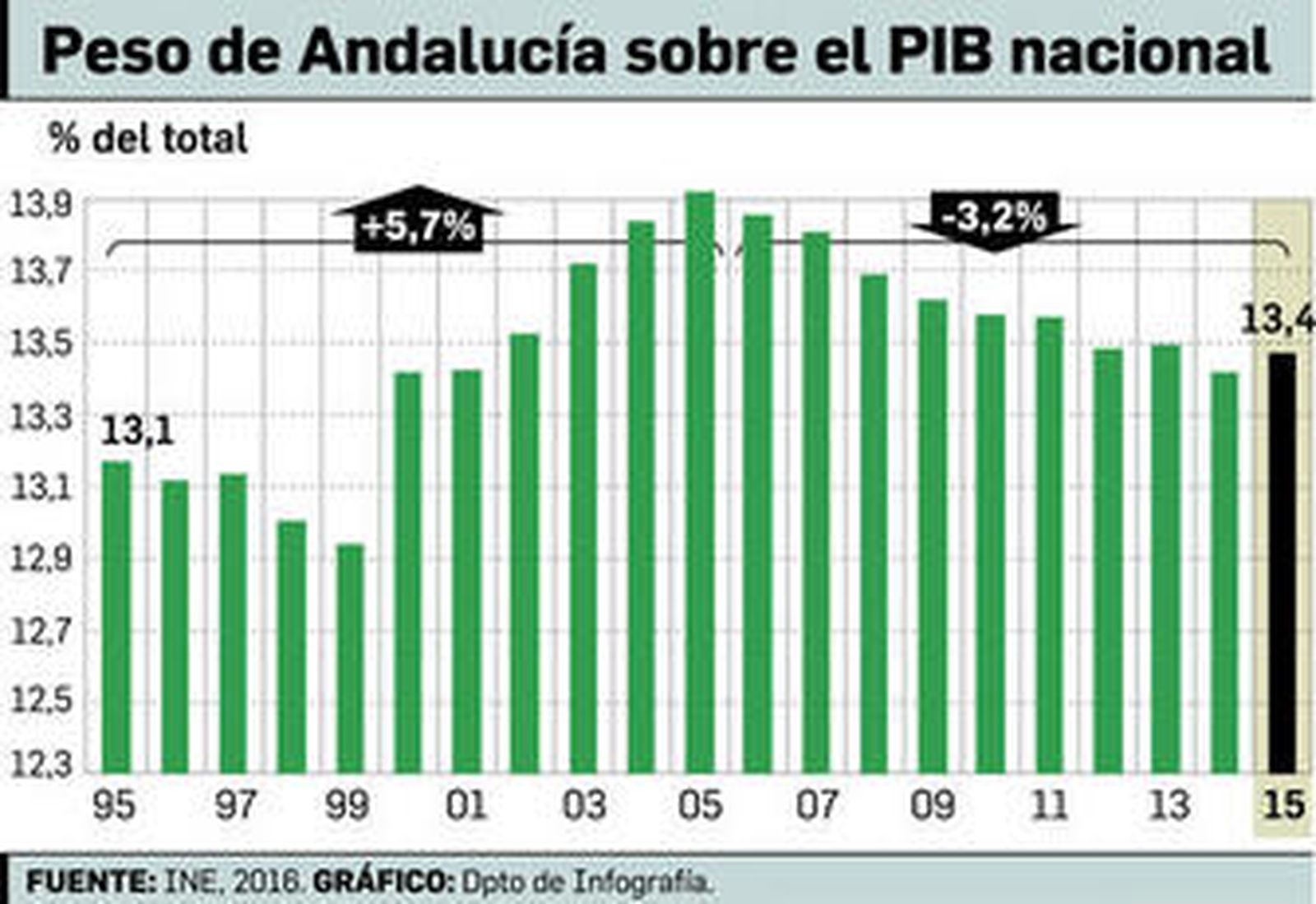 "La economía andaluza no va mal, pero la recuperación es algo menos intensa que en España", precisó Ferraro. De hecho, en el segundo trimestre de 2016, el OEA constata que la subida del PIB (Producto Interior Bruto) andaluz fue inferior a la del trimestre anterior, con un incremento del 0,6%, y dos décimas por detrás del español. En términos interanuales, el avance de la comunidad fue del 3%, cinco décimas menos que en el primer trimestre y dos menos que el PIB nacional.