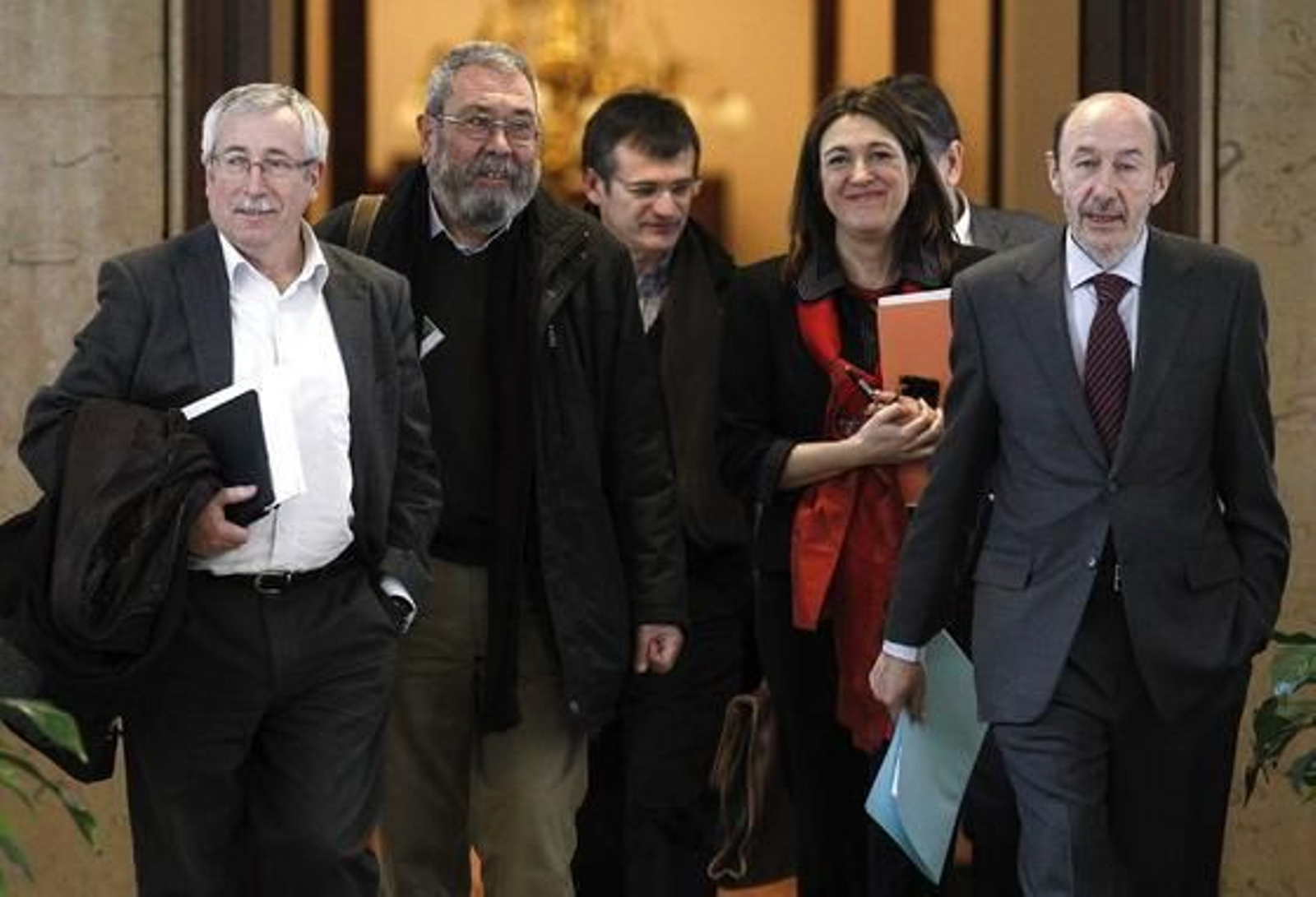 CCOO, UGT y PSOE han pedido al Gobierno un cambio en su política económica para que dé prioridad al empleo y no a la reducción del déficit ante un año que comienza con más de seis millones de parados. Los secretarios generales de CCOO, Ignacio Fernández Toxo, y de UGT, Cándido Méndez, se han reunido en el Congreso con el secretario general del PSOE, Alfredo Pérez Rubalcaba, para analizar las propuestas sindicales contra la crisis, dentro de la ronda de contactos que están manteniendo ambas organizaciones sindicales con los partidos políticos. El pasado 21 de diciembre, Toxo y Méndez presentaron el documento conjunto con dichas propuestas para dirigirlas al Gobierno, a los partidos y a la patronal, convencidos tras la huelga general y las manifestaciones, de que la sociedad está demandando un cambio en las políticas del Ejecutivo.
