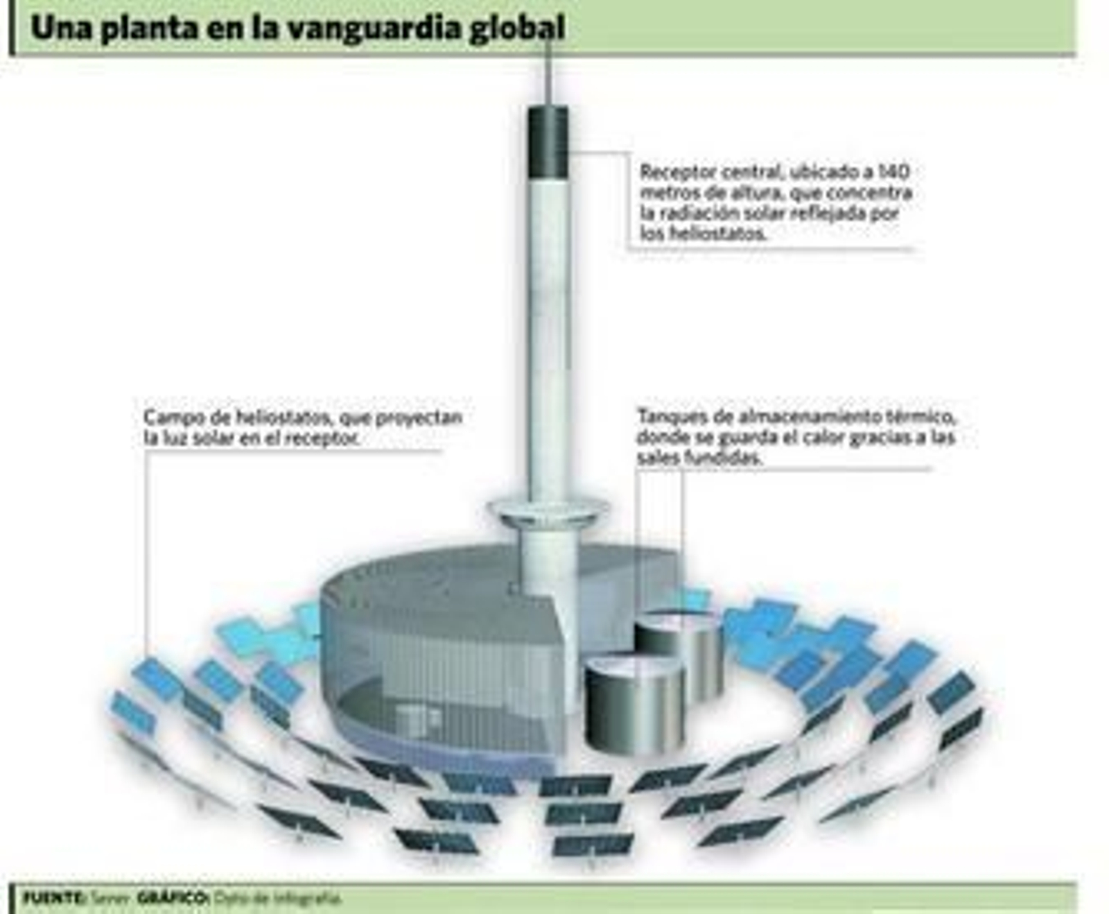 Ignacio Grimaldi, director de proyectos en Andalucía de Torresol Energy, explica que la razón de esta singular configuración de los heliostatos está en el modo de funcionamiento previsto para la central. "El receptor hacia el que apuntan los espejos, en el extremo de la torre, está dimensionado para calentar un volumen de sales fundidas que permita, primero, producir el vapor necesario para que la turbina de la planta funcione durante las horas de sol. Y, segundo, para que parte de esas sales calientes se acumulen en depósitos y permitan a la central seguir generando por la noche o cuando haya menos radiación".