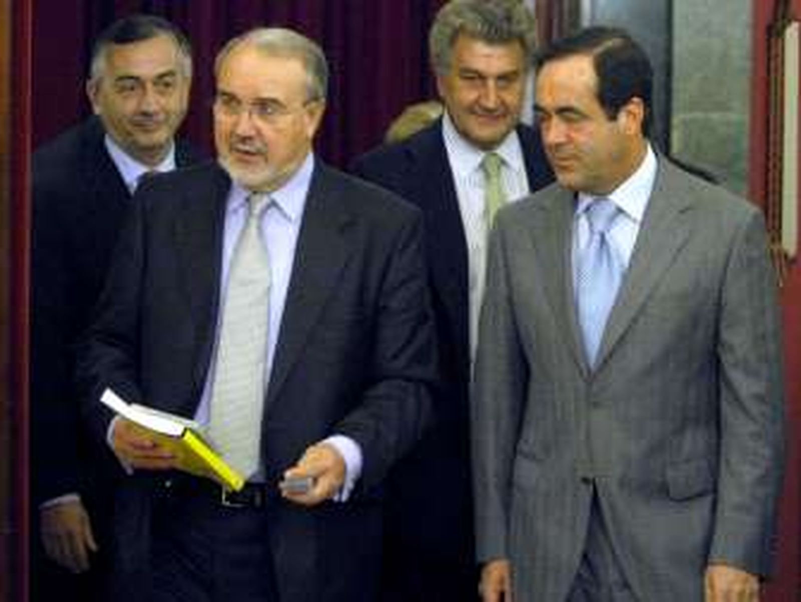 Solbes, Bono y otros altos cargos del Ministerio de Economía y Hacienda, junto al presidente de la Comisión de Presupuestos del Congreso, Jesús Posada, acudieron después al Salón de Pasos Perdidos, donde media hora más tarde el ministro de Economía y el presidente del Congreso presentaron formalmente los Presupuestos Generales del Estado de 2009.