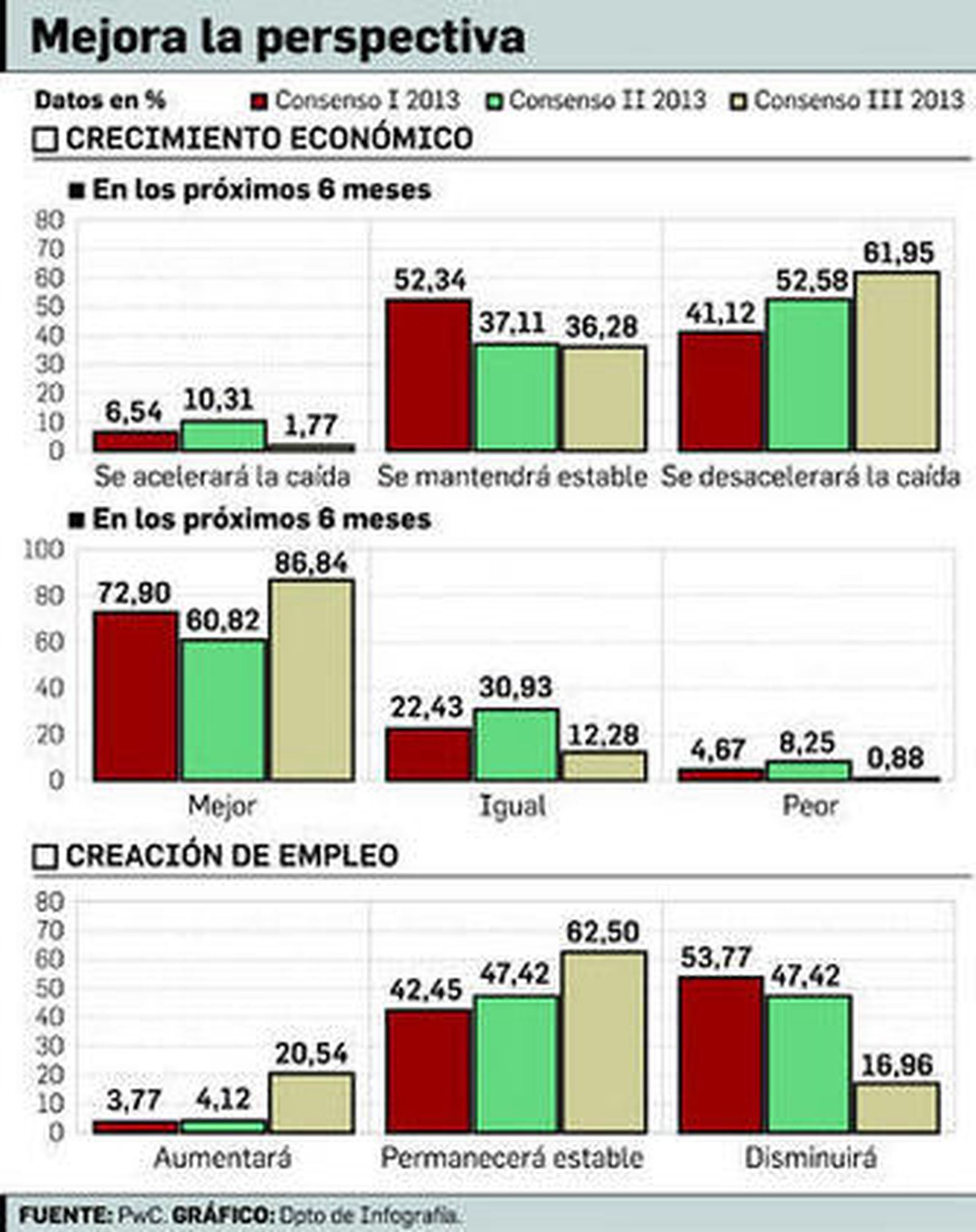El consenso económico de la consultora eleva sus expectativas sobre crecimiento, inversión de las empresas, consumo de las familias y creación de empleo, sobre todo a finales de 2014