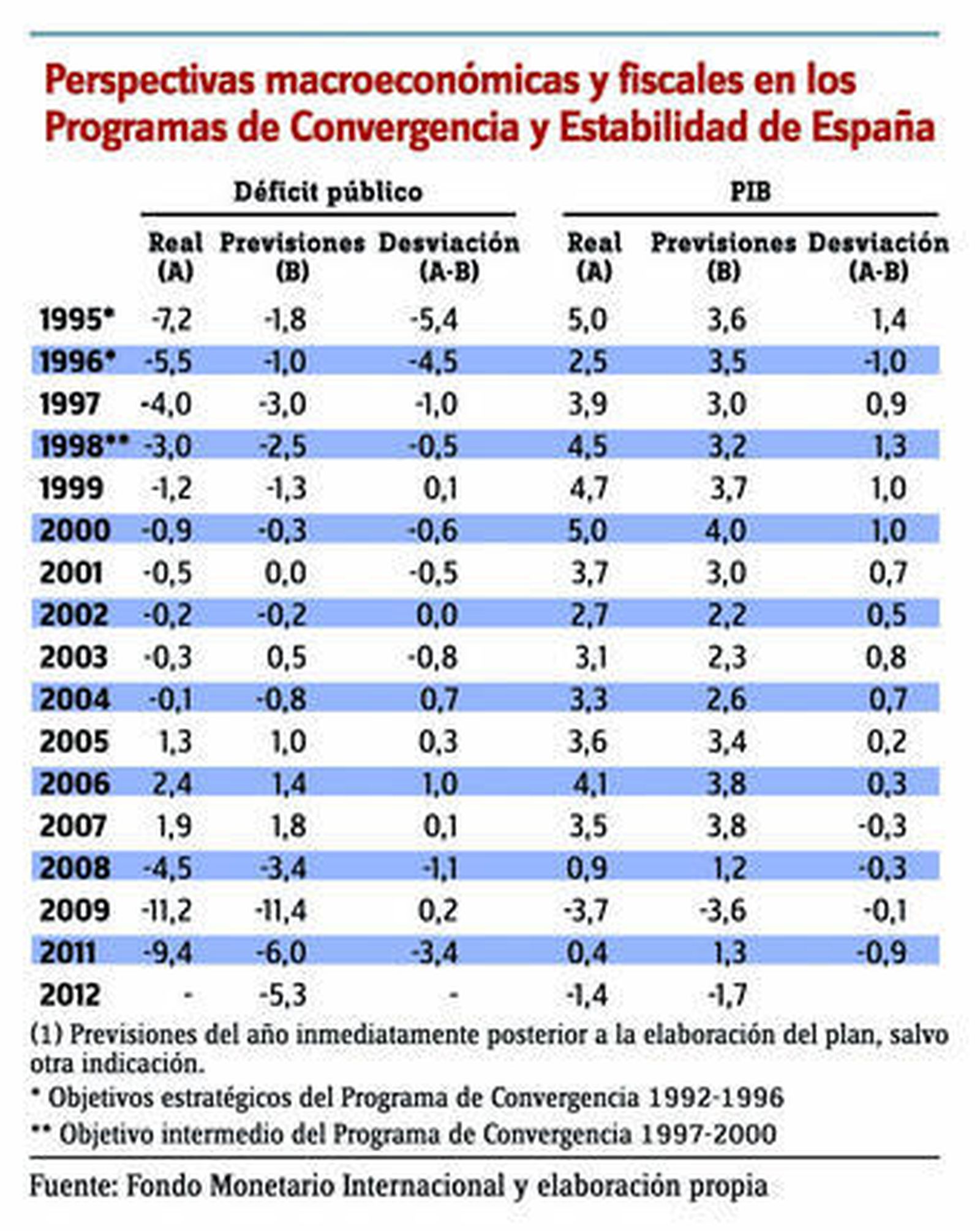 El Plan de Convergencia 1992-1996 recogió el primer compromiso del gobierno de España con los criterios de convergencia nominal establecidos en Maastricht. En su momento fue criticado por "su exceso de optimismo en el diseño de la política presupuestaria y por la lentitud y descoordinación de las reformas estructurales", frase que parece, con la perspectiva histórica, un estribillo intemporal aplicable al diseño de cualquier presupuesto. En cualquier caso, la recesión de 1993 se encargó de anular el intento de consolidación fiscal que pretendía y el plan tuvo que actualizarse, esta vez para el período 1994-1997. La elaboración del siguiente plan (Plan de Convergencia 1997-2000) coincidió con una notable intensidad de la recuperación económica, que facilitó alcanzar los objetivos exigidos para la adopción de la moneda única, si bien después de que la Comisión Europea recomendara al Consejo que revocara su decisión de constatar un déficit excesivo en España.