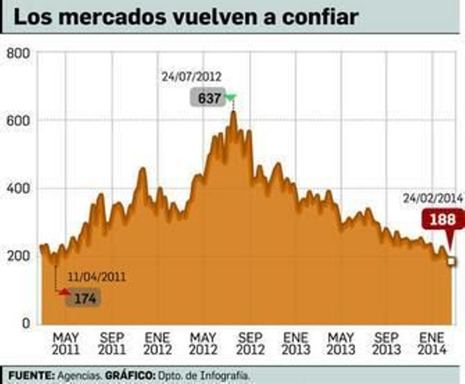 Justo cuando se cumple un año y medio desde su máximo histórico, la prima de riesgo y el interés de la deuda española se afianzan en niveles previos a la crisis. La rentabilidad ofrecida en los mercados secundarios por los bonos españoles a diez años se consolidó ayer tras la apertura de los mercados por debajo de la barrera del 3,60%, manteniéndose así en el entorno de los mínimos observados en 2006, después de que la agencia Moody's decidiera el pasado viernes elevar un escalón el rating de España, hasta Baa2 con perspectiva positiva. En concreto, tras la apertura de las bolsas europeas, el interés del bono español a diez años se relajaba hasta el 3,520%, lo que implica un diferencial respecto al bono alemán a diez años de 185,70 puntos básicos, aunque finalmente cerró en el entorno de los 188 puntos.