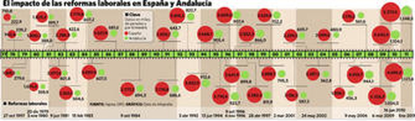 Hasta 17 veces entre 1977 y 2011 ha retocado el Gobierno, acompañado o no por los agentes sociales, el marco laboral español. La premisa siempre fue obvia: modificar para pulir, para mejorar, para aproximar al país a un entorno, el europeo, donde nadie nunca ha padecido, de manera tan bestialmente estructural, el problema del paro, esa mancha que ensombrece hasta anularlas algunas virtudes nacionales.