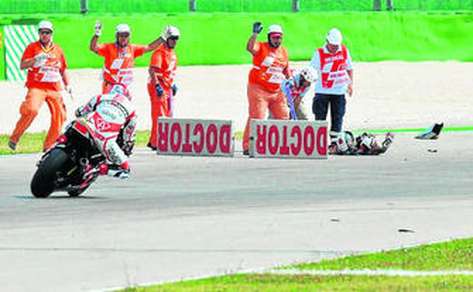 lEl fallecimiento del piloto japonés de Moto2 Shoya Tomizawa tras el accidente sufrido en la duodécima vuelta del Gran Premio de San Marino tiñó de negro un fin de semana en el que el motociclismo español pudo firmar un nuevo triplete con las victorias de Dani Pedrosa (Honda) en Moto GP, Toni Elías (Moriwaki) en Moto2 y Marc Márquez (Derbi) en 125cc. El piloto japonés, de 19 años, murió en plena carrera, tras una caída en la que fue atropellado. El nipón sufrió un brutal atropello en la vuelta 12 que dejó en el suelo al británico Scott Redding y al italiano De Angelis, que le seguían muy de cerca y que pisaron a la víctima. Tomizawa fue traslasado al hospital Riccione pero llegó con múltiples traumatismos y hemorragias internas.