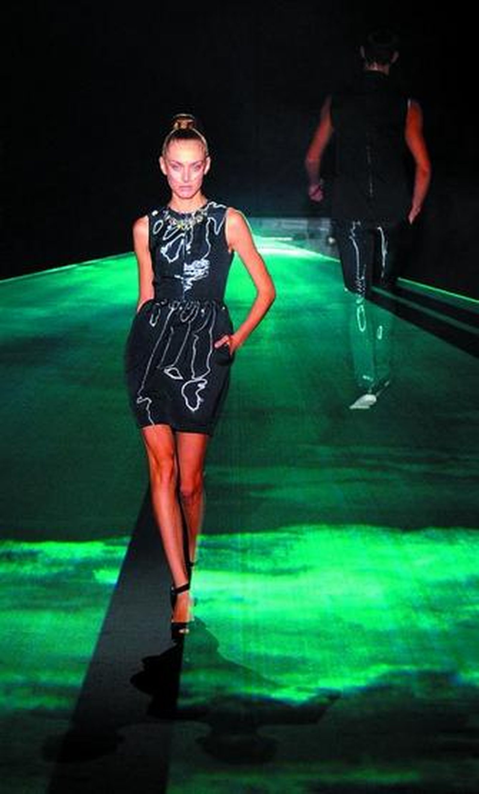 l El diseñador David Delfín se lució ayer en la Cibeles Madrid Fashion Week, donde mostró su última colección. Acompañado de amigos como Pedro Almodóvar, Miguel Bosé, Rossy de Palma o Alaska, el malagueño rompió en Diastema con sus anteriores muestras con siluetas menos ambiguas que destacan la feminidad de la mujer, abundaban las combinaciones en blanco y negro y una amplia gama de rosas y colores maquillaje.