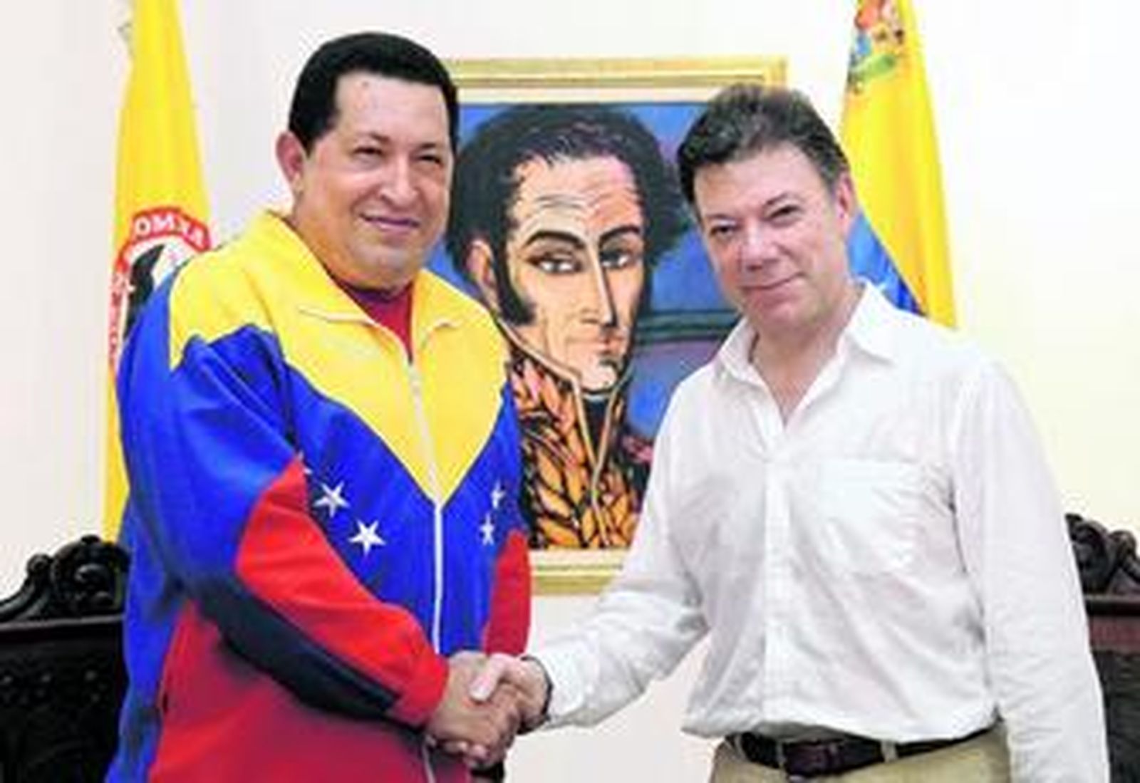 lDos hombres, dos estilos. Los presidentes de Venezuela, Hugo Chávez, y Colombia, Juan Manuel Santos, se reunieron ayer en la localidad de Santa Marta, en el mismo palacio donde murió Simón Bolívar, el libertador iberoamericano, para sellar una 'entente cordiale' que rebajará la tensión diplomática existente durante los últimos meses entre ambos países como resultado de las acusaciones mutuas sobre sus políticas en relación al terrorismo, lacra que padece Colombia. Chávez, que acudió al encuentro con un chándal con los colores de la bandera de su país -similar al que ha utilizado Fidel Castro con la bandera cubana durante su larga convalecencia hasta hace sólo unos días-, negó que su Gobierno apoye las actividades de la guerrilla colombiana. Santos eligió una indumentaria más formal y se mostró esperanzado en mejorar las relaciones con la república venezolana.