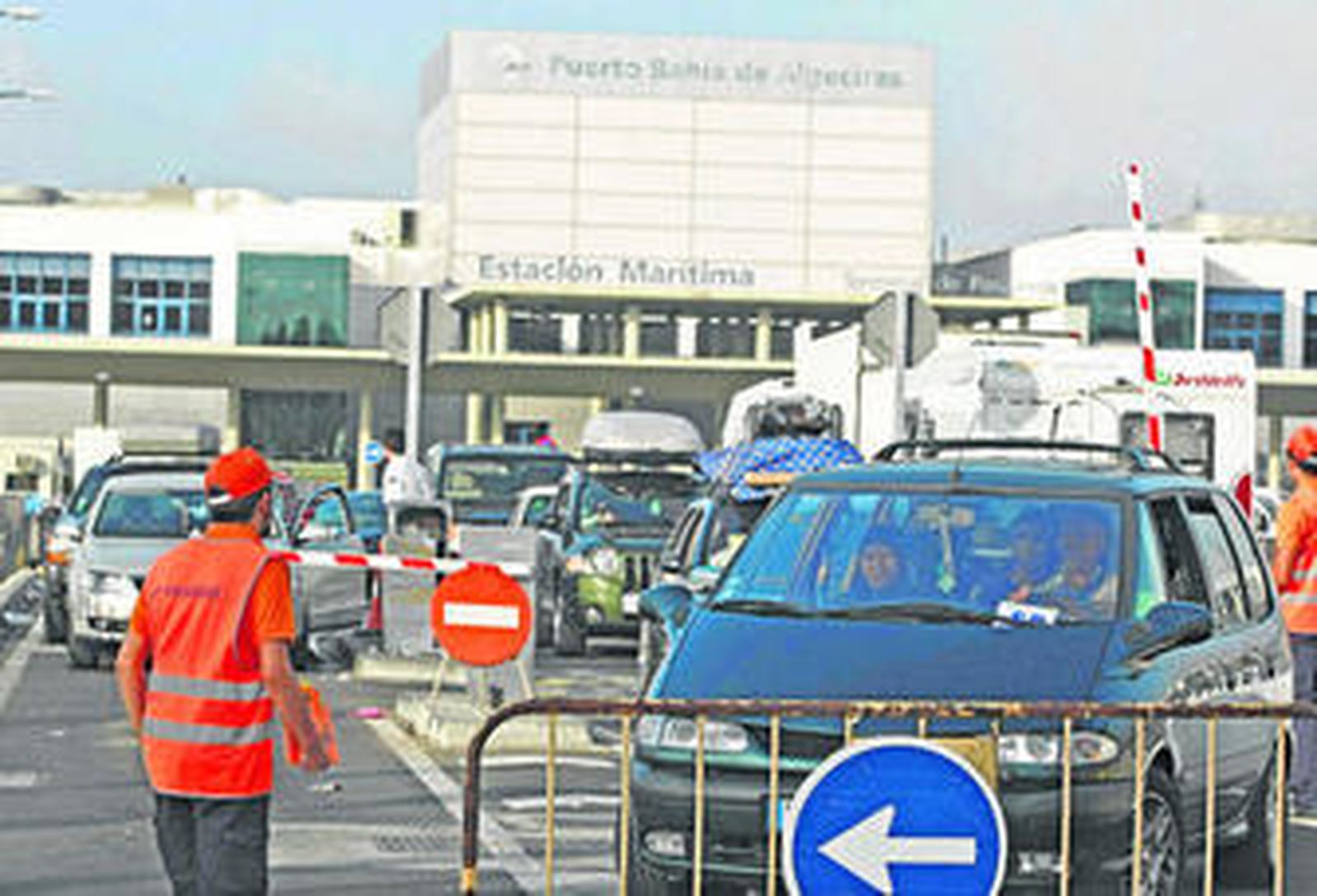 lLa Operación Paso del Estrecho (OPE) transcurre con normalidad en el puerto de Algeciras. El dispositivo de Protección Civil para facilitar el tránsito de los magrebíes a sus países de origen está siendo un éxito. Alrededor de medio millón de personas han cruzado ya hacia África a bordo de los ferrys que salen desde Algeciras y Tarifa. El tránsito de pasajeros y vehículos, no obstante, está siendo menor al del año pasado, lo que las autoridades españolas achacan a la crisis económica y a que los vuelos de bajo coste que unen Europa con Marruecos son ya una alternativa al barco. El dispositivo no requirió tampoco este fin de semana utilizar la zona de preembarque del Llano Amarillo ya que hubo fluidez en los embarques. En la imagen, efectivos guían a vehículos de magrebíes cerca de la estación marítima del puerto de Algeciras.