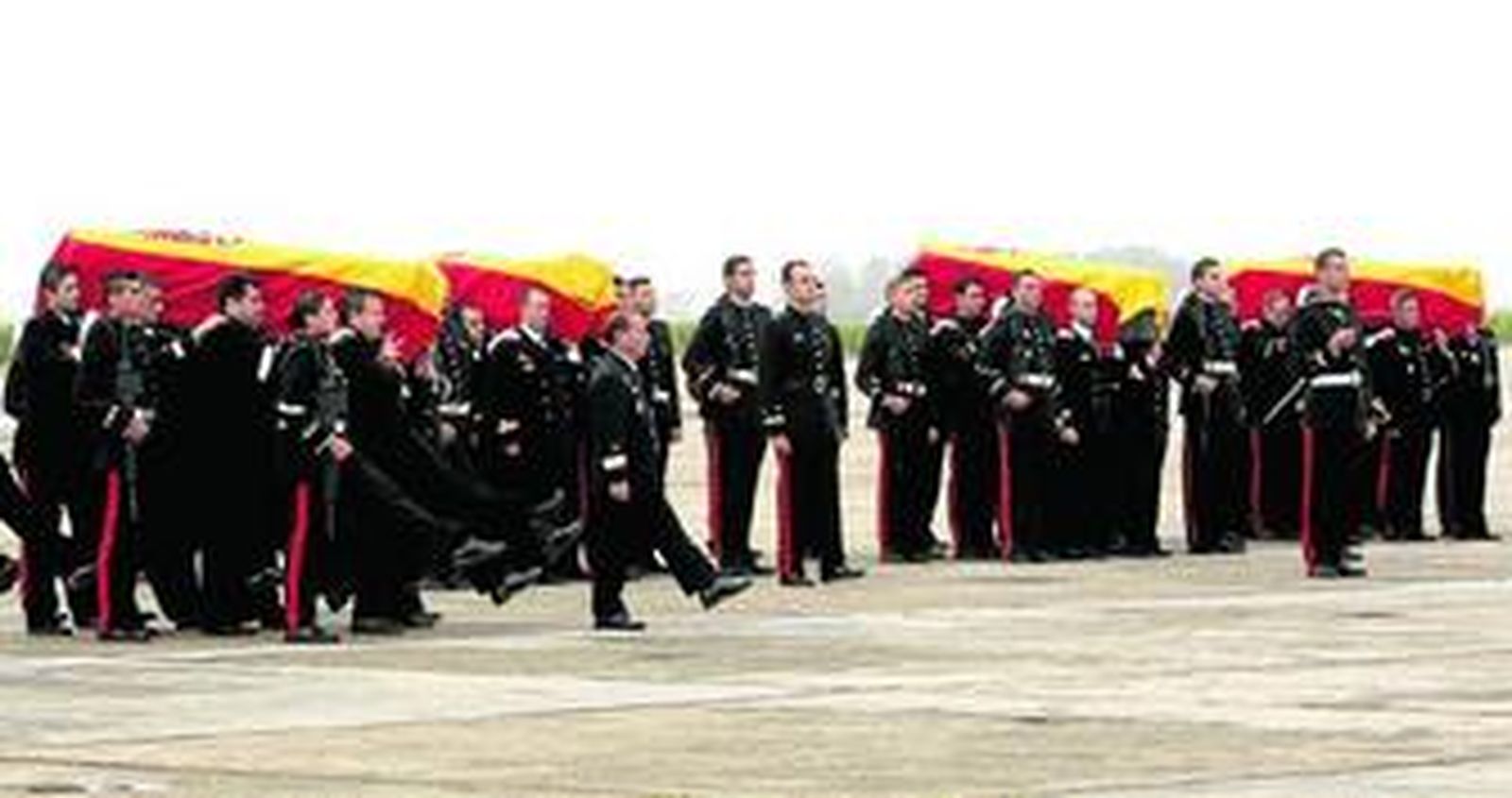 lCompañeros de la Armada de los cuatro militares fallecidos el viernes en Haití portan los féretros de éstos ayer a su llegada a la base de Rota. Los funerales se han retrasado hasta hoy, ya que antes se han debido realizar las autopsias en el Instituto Anatómico Forense de Cádiz. El funeral de hoy estará presidido por los Reyes, y está previsto que acudan el presidente del Gobierno, José Luis Rodríguez Zapatero, y el jefe de la oposición, Mariano Rajoy. El presidente de la Junta, José Antonio Griñán, también estará en la base militar, así como los alcaldes de la Bahía de Cádiz, donde residían los cuatro muertos en el accidente de Haití.