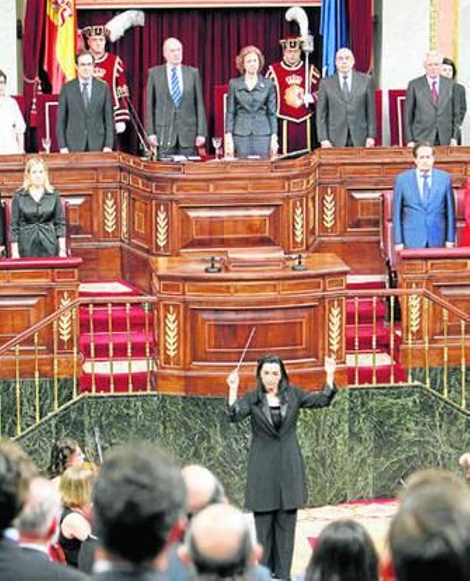 l El Rey definió ayer a las víctimas del terrorismo como un símbolo de la democracia española. Don Juan Carlos y doña Sofía presidieron en el Congreso el Día de las Víctimas del Terrorismo, durante el que el presidente de la Cámara, José Bono, realizó un alegato en contra de la división de los partidos sobre el terrorismo. En la imagen, los Reyes escuchan a la Orquesta Sinfónica de Chamartín, que interpretó el himno nacional y una pieza de Dvorak.