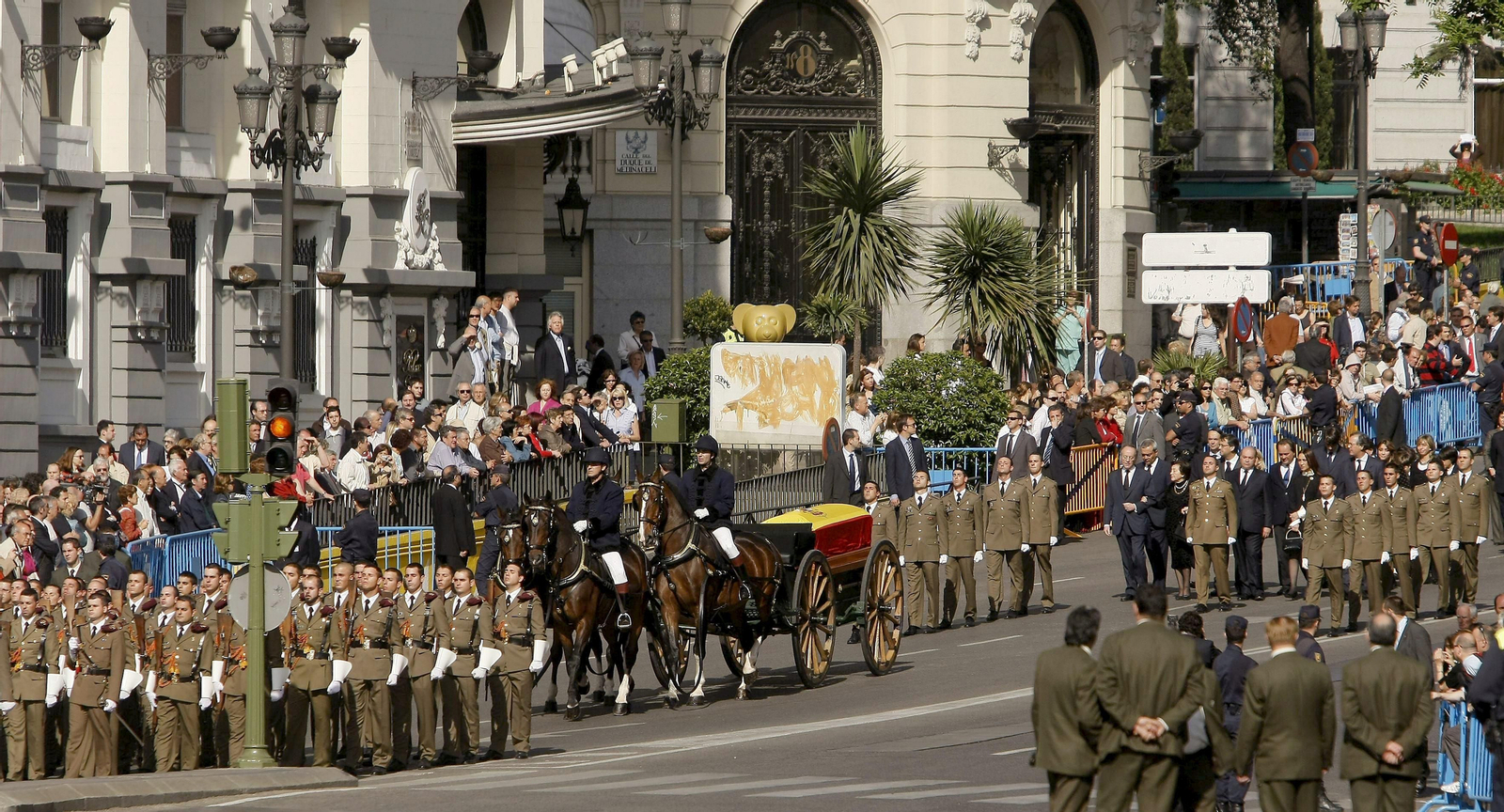Cubierto con la bandera de España y bajo los acordes del himno nacional, el féretro ha sido portado a través de la Puerta de los Leones del Congreso por militares del Ejército de Tierra que lo han colocado sobre un armón. Nada más abandonar el edificio, se ha guardado un minuto de silencio y, a continuación, el armón ha sido conducido a la madrileña Plaza de Neptuno, seguido del cortejo fúnebre que encabezaban la familia del ex presidente del Gobierno, precedida por su viuda, Pilar Ibáñez Martín, sus ocho hijos, y sus nietos, que portaban ramos de flores. Tras la familia se situaban el presidente del Gobierno, José Luis Rodríguez Zapatero, junto a los presidentes del Congreso, José Bono, y el Senado, Javier Rojo, quienes han acompañado al féretro en su salida de las dependencias del Congreso.