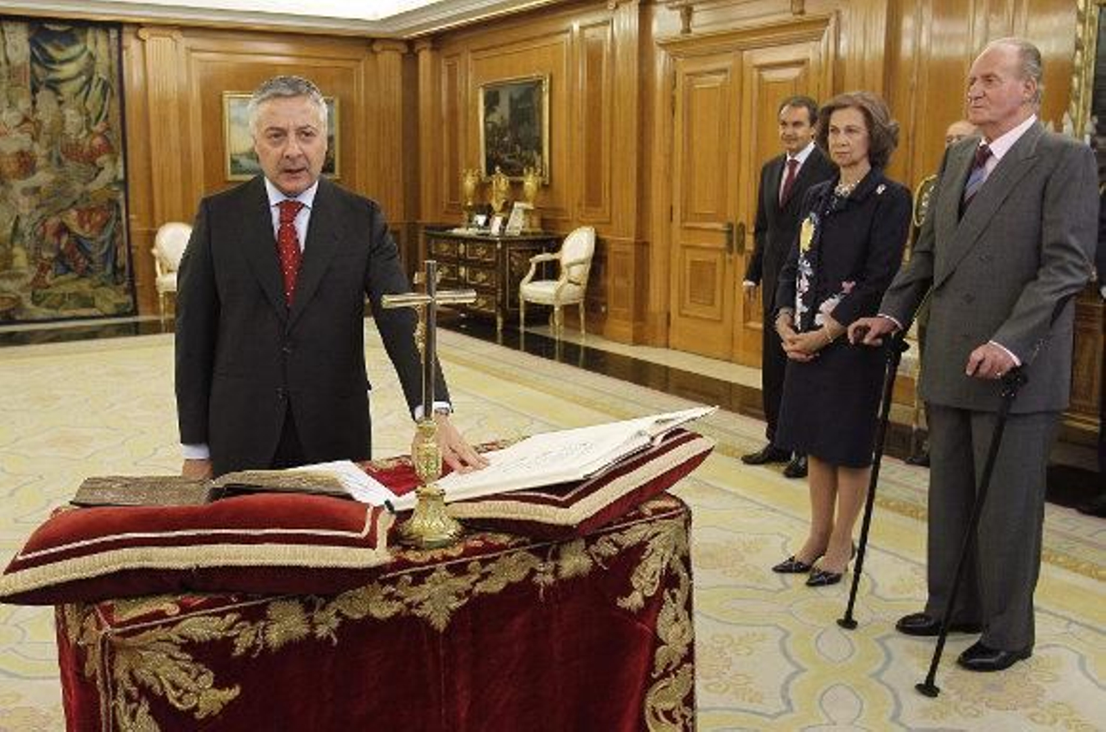 Ante un ejemplar de la Constitución, un crucifijo y una Biblia dedicada al Rey Carlos IV, abierta por el capítulo XXX sobre el voto y juramento, perteneciente al Libro de los Números, los vicepresidentes Elena Salgado y Manuel Chaves, junto al ministro de Fomento y nuevo portavoz, José Blanco, y el titular de Interior, Antonio Camacho, han ido uno a uno prometiendo sus cargos.