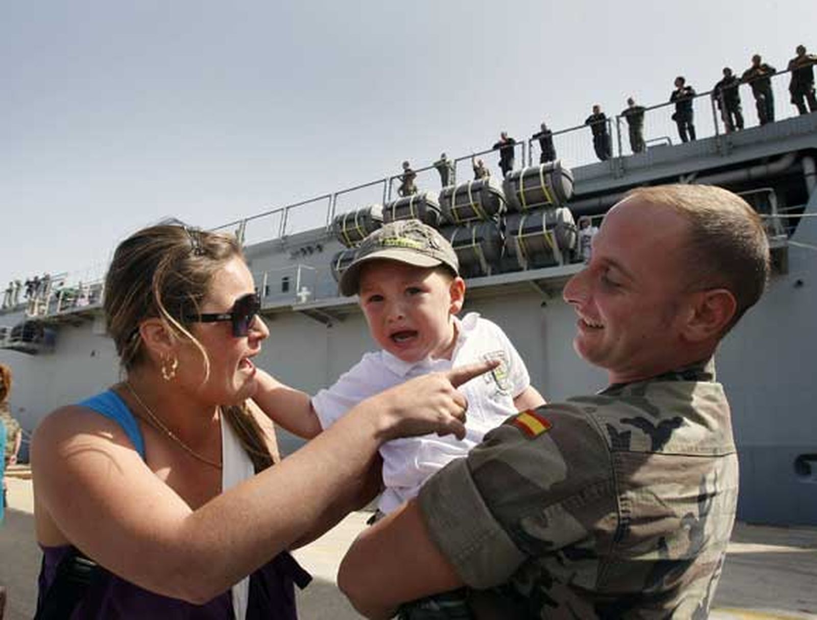 La dotación del buque llegó a la Base Naval de Rota, donde hace justo un mes el Rey Don Juan Carlos I impuso, a título póstumo, la Cruz al Mérito Naval a cuatro de los tripulantes de este buque que fallecieron el pasado 16 de abril en un accidente de helicóptero cuando se encontraban desplegados en misión humanitaria en el país haitiano.