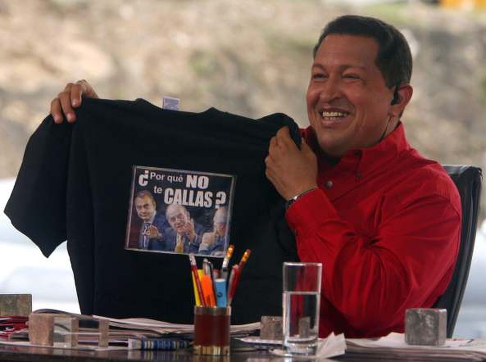 El presidente de Venezuela, Hugo Chávez, mostró hoy entre risas la camiseta que hace dos días le regaló el rey Juan Carlos I de España ilustrada con la ya famosa frase que le dirigió a finales del año pasado en Chile: "¿Por qué no te callas?". Chávez recibió durante su reciente visita a España, de manos del rey, la camiseta que lleva estampada la fotografía que recoge el momento vivido en la Cumbre Iberoamericana de Santiago de Chile.
