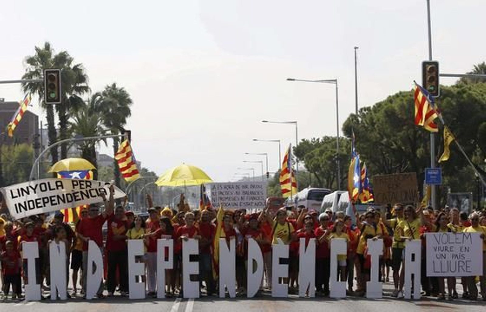 Cientos de miles de personas se han manifestado en Barcelona a favor de la consulta soberanista convocada para el 9 de noviembre, formando una gran V con los colores de la bandera catalana a lo largo de once kilómetros de la avenida Diagonal y la Gran Vía de la Ciudad Condal. La Delegación del Gobierno en Cataluña ha cifrado entre 470.000 y 520.000 personas el número de participantes de la denominada Vía Catalana, cifra que la Guardia Urbana ha elevado a 1,8 millones, lo que ha llevado a los organizadores de la protesta, la Asamblea Nacional Catalana (ANC) y Òmnium Cultural, a hablar de "la manifestación más multitudinaria de Europa". En un comunicado, la Delegación del Gobierno ha explicado que, "dado que la superficie de la concentración es de 200.000 metros cuadrados", en una manifestación de 11 kilómetros, y a partir del cálculo de una densidad de dos o tres personas por metro cuadrado según las imágenes de diferentes tramos, los manifestantes no pueden superar las 520.000 personas.