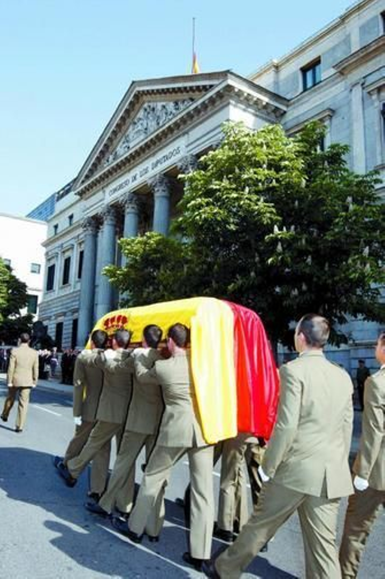 Al pie de las escalinatas de la Puerta de los Leones, que se abrió para la ocasión -algo que sólo ocurre una vez cada cuatro años en la solemne apertura de cada legislatura-, aguardaban al féretro el presidente del Gobierno, José Luis Rodríguez Zapatero, y su esposa, Sonsoles Espinosa; los presidentes del Congreso y del Senado, José Bono y Javier Rojo, y la presidenta del Tribunal Constitucional, María Emilia Casas. Junto a ellos, los miembros de la Mesas de ambas Cámaras y el jefe del Estado Mayor de la Defensa, Félix Sanz Roldán.
