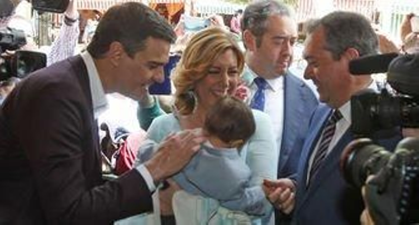 A las 15:10, llega Susana desde la caseta municipal acompañada, entre otros, por el alcalde. "¡Guapa, guapa!", se escucha. La presidenta va con su hijo vestido de corto. "Dejadse de Feria y haced un pacto ya con el PP", grita otro. La escena ya está montada y los cámaras no dan abasto. Espadas es el invitado en la fotografía que todos querían. El encuentro, con medias sonrisas, sólo lo enfría el pequeño José María al que todos hacen carantoñas. La presidenta está en su terreno y se nota. Desde su llegada, compite con Sánchez por ver quién es más solicitado para hacerse fotos y dar besos. La bulla junto a la reja cada vez es mayor. Y así durante casi una hora. Se marcha la presidenta como llegó. Al poco, lo hace Sánchez. Tiene previsto visitar otras casetas. Camino de la de la UGT, ya con la Feria repleta, se lleva más parabienes, pero también muchos reproches y algún silbido y abucheo. El real es una extensión del hemiciclo.