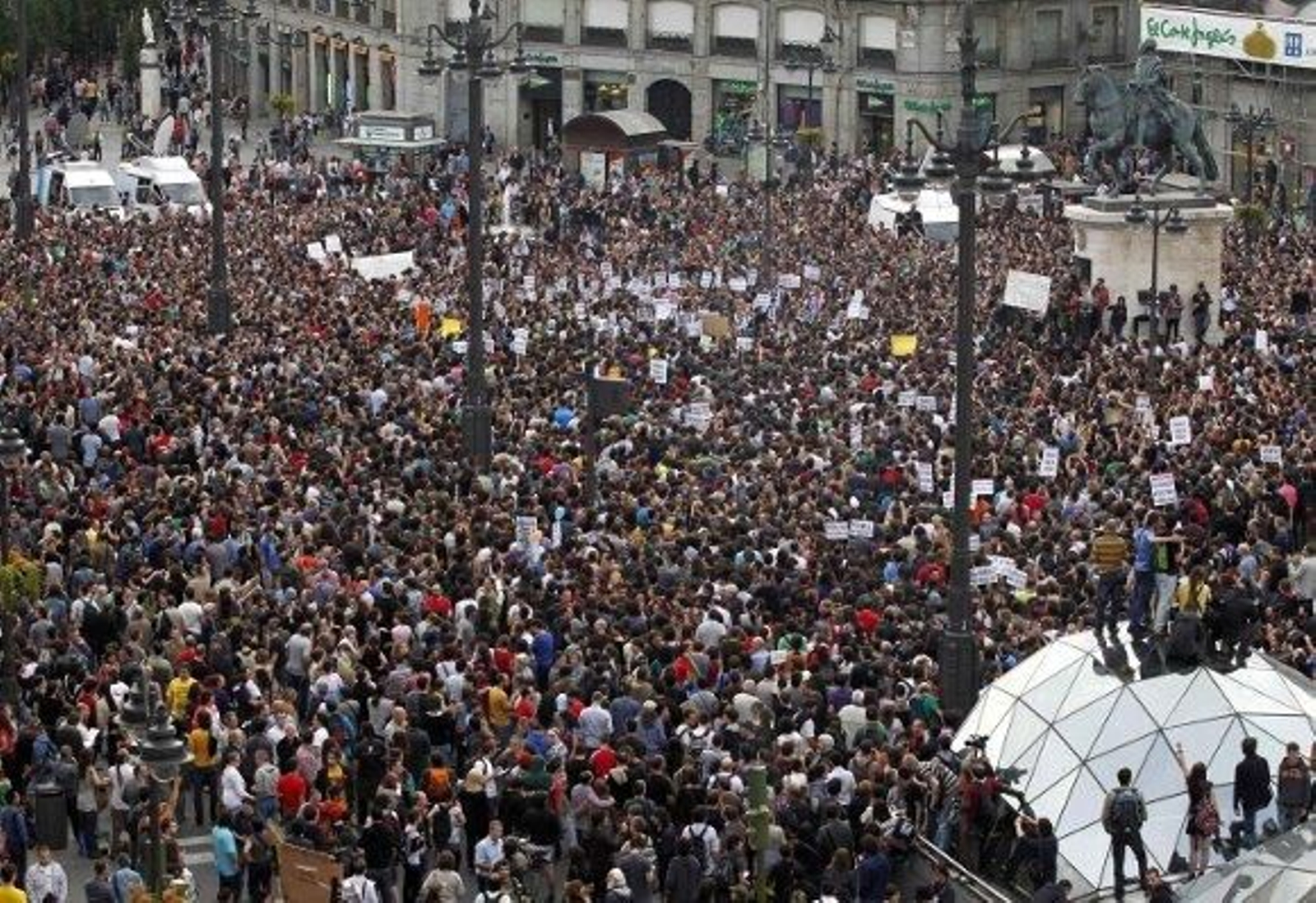 Las pancartas contra la clase política y las élites económicas han teñido de color la madrileña plaza de Sol con lemas como "Nosotros os votamos, nosotros os botamos", "Que se queden en paro banqueros y políticos; otra crisis es posible", "No por mucho cotizar te jubilas más temprano" o "Yo también quiero ser irlandés".