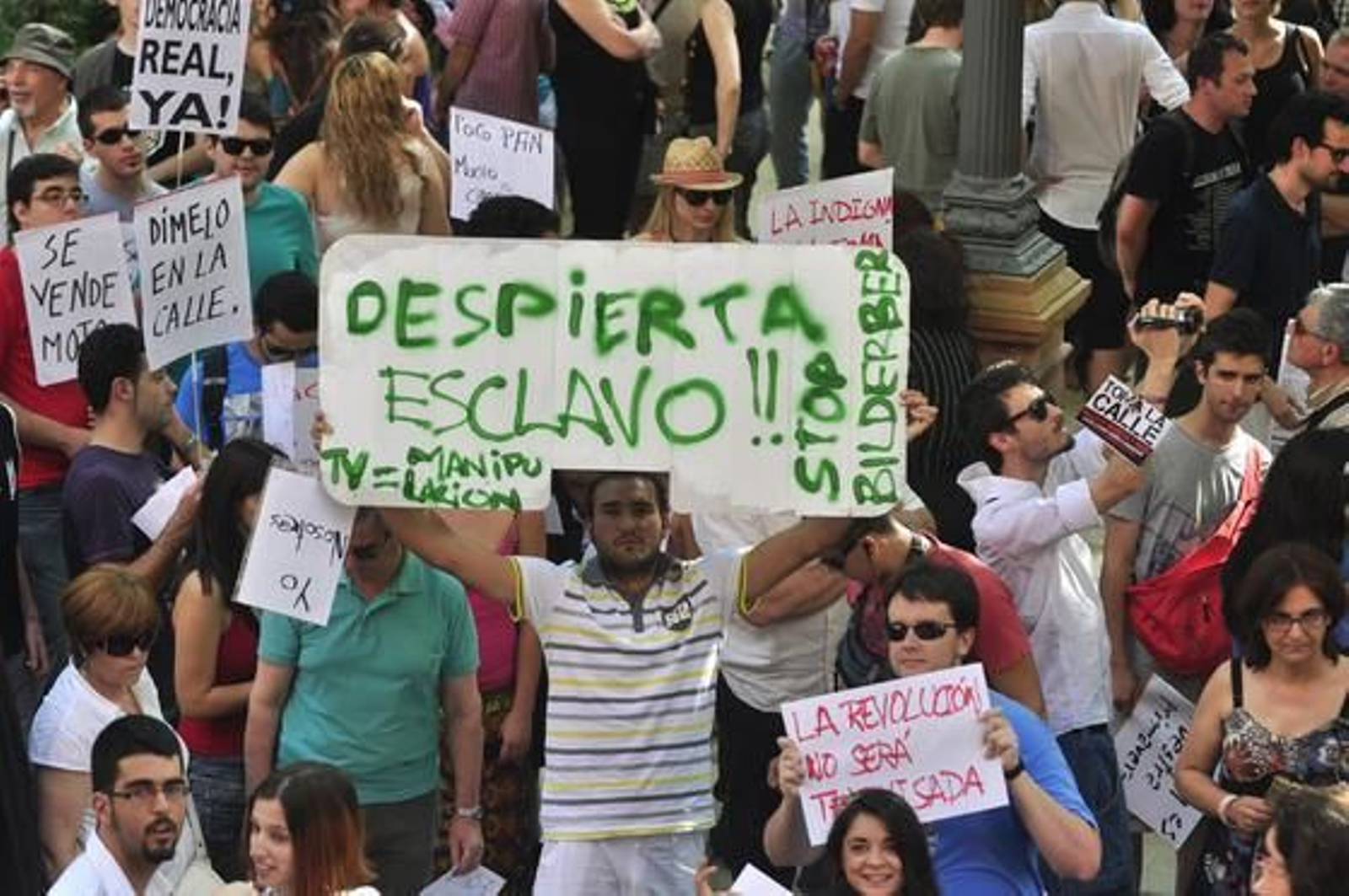 Las marchas, convocadas en Madrid, Barcelona, Valencia, Sevilla, Granada, Málaga, Córdoba y otras capitales andaluzas y españolas, ha mostrado pancartas que rezaban "No somos mercancías en manos de políticos y banqueros" y quienes las portaban clamaban "No los votes". Varios de los asistentes, principalmente jóvenes, vestían camisetas amarillas con el lema "sin casa, sin curro, sin pensión y sin miedo", firmadas por Juventud sin futuro, y muchos otros llevaban camisetas negras con la leyenda "las calles son nuestras". Los participantes han coreado consignas como "España, escucha, así es cómo se lucha" y han exhibido varias pancartas pequeñas alusivas a la insumisión de Islandia a reconocer su deuda.