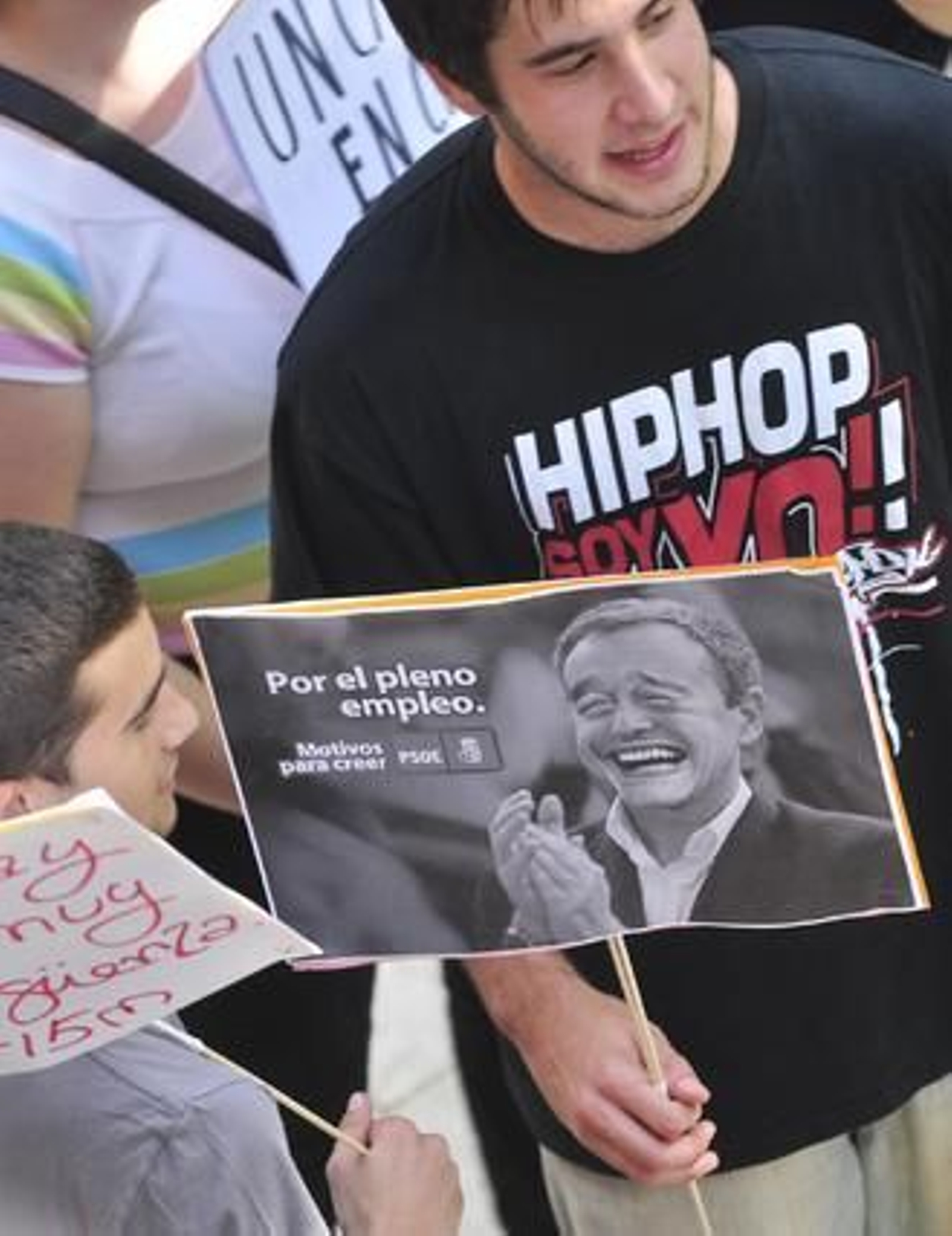 A la marcha se fue sumando gente conforme avanzaba hacia el centro. A la pancarta con el lema No somos mercancía en manos de políticos y banqueros le seguían carteles con frases como “Los bancos nos roban”, “Ellos comen canapés, yo no llego a fin de mes”, “Poco pan para tanto chorizo”, “Tengo un contrato basura”, “No rescatéis a los bancos” o “No voy a tener una casa en mi vida”. Había también quien quería mandar al paro a la ministra de Cultura, Ángeles González-Sinde, a la que acusan de intentar coartar el libre acceso a la cultura con su polémica ley. Pero quien se llevó más gritos fue su jefe, el presidente del Gobierno, a quien se encargaron de recordarle una y otra vez que el paro roza los cinco millones.