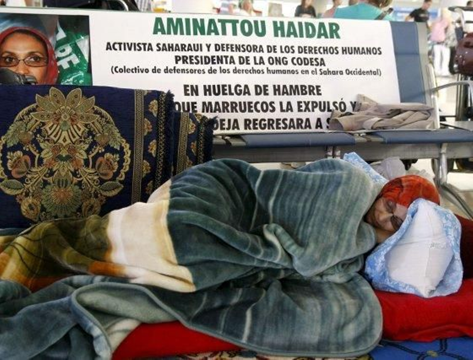 Haidar permanece arropada en las instalaciones aeroportuarias por aproximadamente medio centenar de personalidades del mundo de la cultura, representantes políticos, asociaciones de todo tipo y de toda España, y representantes de la Plataforma de Solidaridad con Haidar, miembros de la comunidad saharaui, del Frente Polisario y una enviada especial de la Fundación Robert F. Kennedy, Boitia Stevens, entre otros.