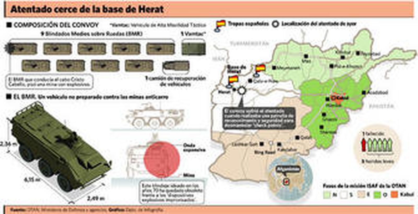 Vuelve el luto a la base de Herat: el cabo español Cristo Ancor Cabello Santana, de 25 años, murió ayer en la localidad afgana de Siah Washan, cerca de la base española, al estallar una mina anti-tanque de gran potencia al paso del vehículo en el que viajaba, en un atentado en el que otros cinco militares sufrieron heridas leves.