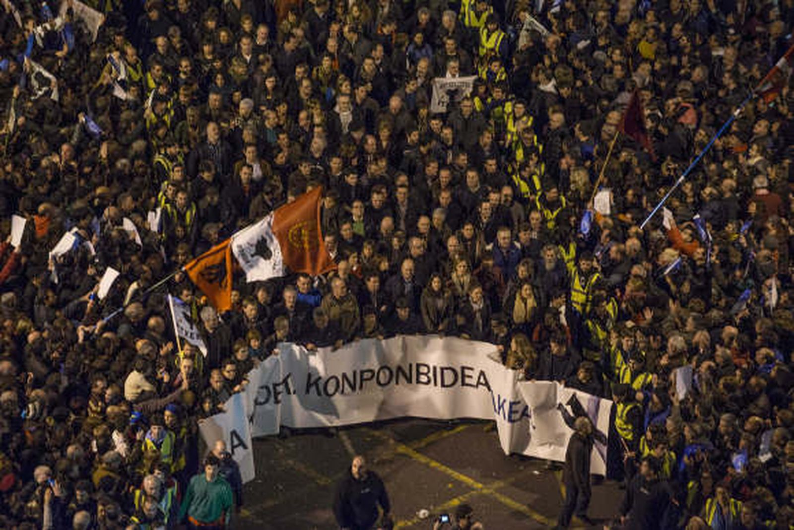 Decenas de miles de personas, entre 100.000 y 110.000 según la Policía Municipal, se han manifestado en la tarde de este sábado en las calles de Bilbao en respuesta al llamamiento de partidos y sindicatos de todo el espectro nacionalista vasco en una marcha en la que se han coreado gritos a favor de los presos de ETA. La manifestación había sido convocada por el PNV, los partidos de EH Bildu -Sortu, EA, Aralar y Alternatiba- y los sindicatos ELA y LAB bajo el lema "Giza eskubideak. Konponbidea. Bakea" (Derechos humanos. Acuerdo. Paz) después de que el juez de la Audiencia Nacional Eloy Velasco prohibiera una movilización de la iniciativa Tantaz Tanta (Gota a gota) en favor de los presos de ETA.