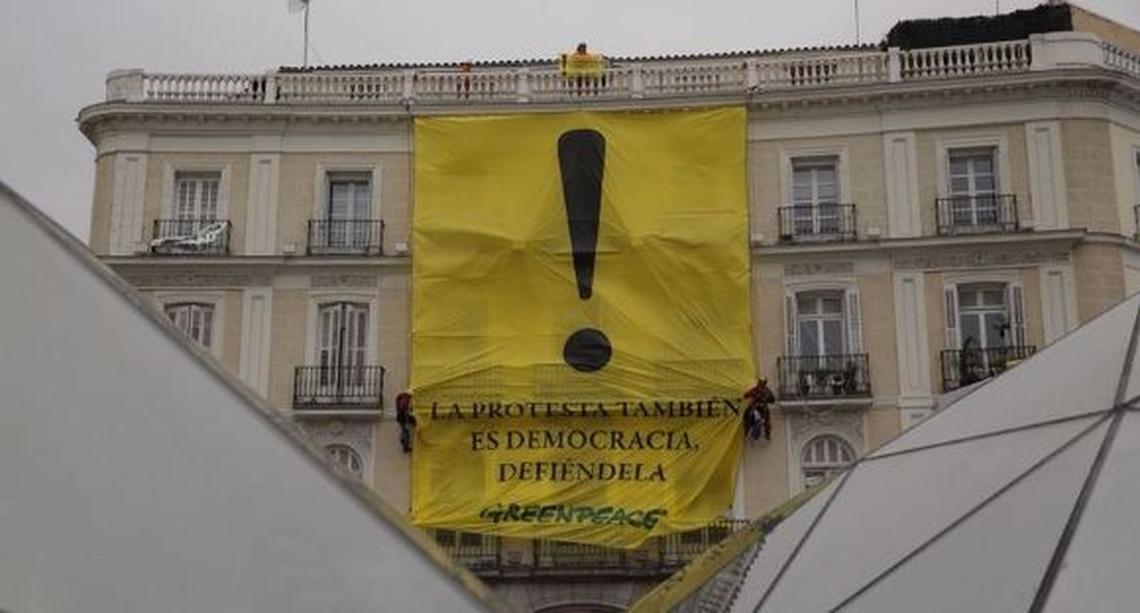 Activistas de la organización ecologista Greenpeace han desplegado una gran pancarta en la Puerta del Sol para reivindicar que "la protesta también es democracia". En la pancarta, colocada en un edificio entre las calles Montera y Alcalá, se puede ver un signo de admiración con el que la organización quiere denunciar "el intento de recorte de las libertades de los ciudadanos por parte del Gobierno", según han confirmado un portavoz de Greenpeace.