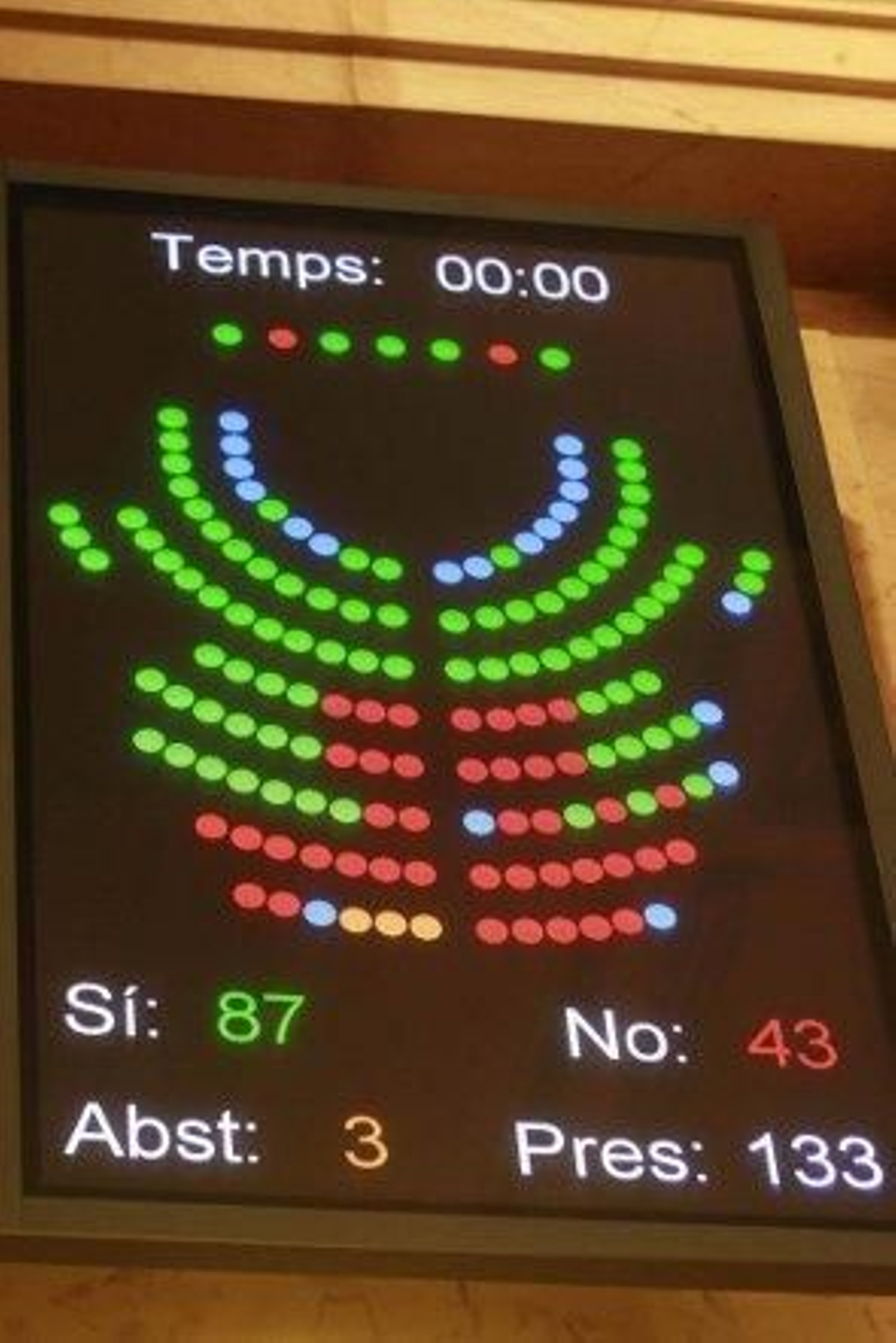 La propuesta ha contado con 87 votos a favor, 43 en contra y tres abstenciones. Tres diputados del PSC han roto finalmente la disciplina y han apoyado la medida soberanista.