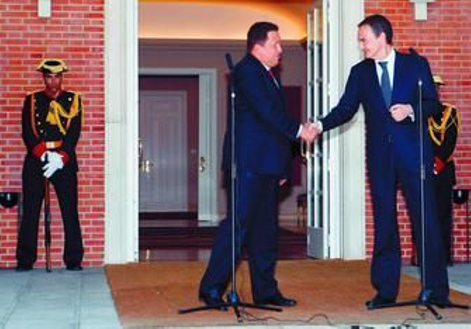 Con casi 45 minutos de retraso, Chávez llegó a La Moncloa procedente de Palma de Mallorca -donde visitó al Rey- y fue recibido por Zapatero con un apretón de manos. La cita duró media hora y ambos coincidieron en calificarla como "positiva". El presidente venezolano propuso a España un acuerdo similar al que acaba de cerrar con Portugal para el intercambio de petróleo -10.000 barriles diarios a 100 dólares (algo más de 63 euros)- por tecnología española para el procesamiento de alimentos o para la búsqueda de fuentes de energía alternativa.