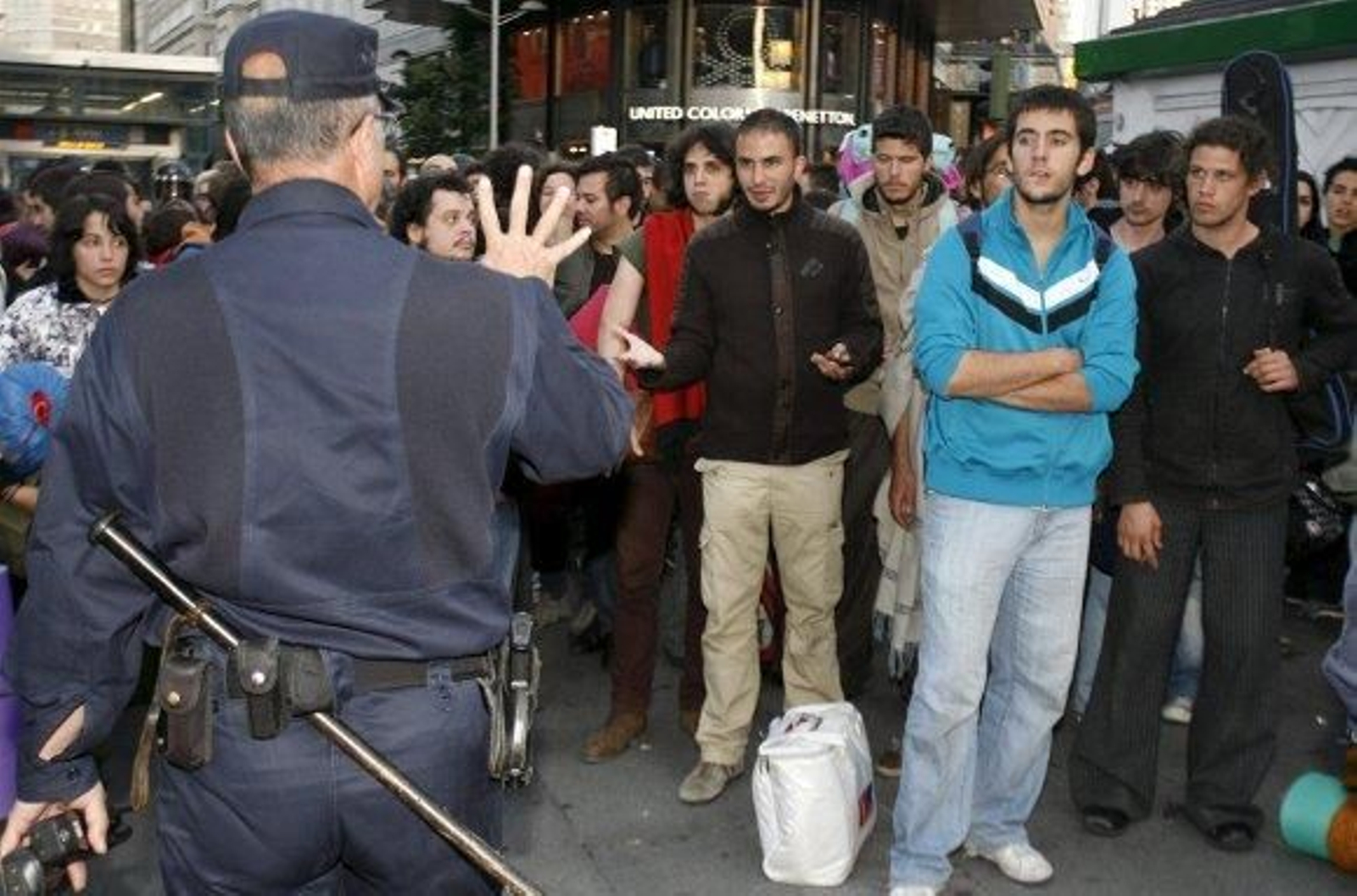 Un agente de Policía Nacional ha informado de que los desalojados no pueden entrar en la Puerta del Sol "por motivos de seguridad" y los han mantenido en dos grupos, uno en la Calle Preciados, y otro en la de Carretas custodiados por las fuerzas de seguridad. Los jóvenes profirieron entonces gritos de protesta como "más educación y menos policía". "Le llaman democracia y no lo es", "Madrid despierta, la calle está indignada" y "Esto es una dictadura, queremos una democracia", son algunos de los lemas que también sostenían en sus pancartas.